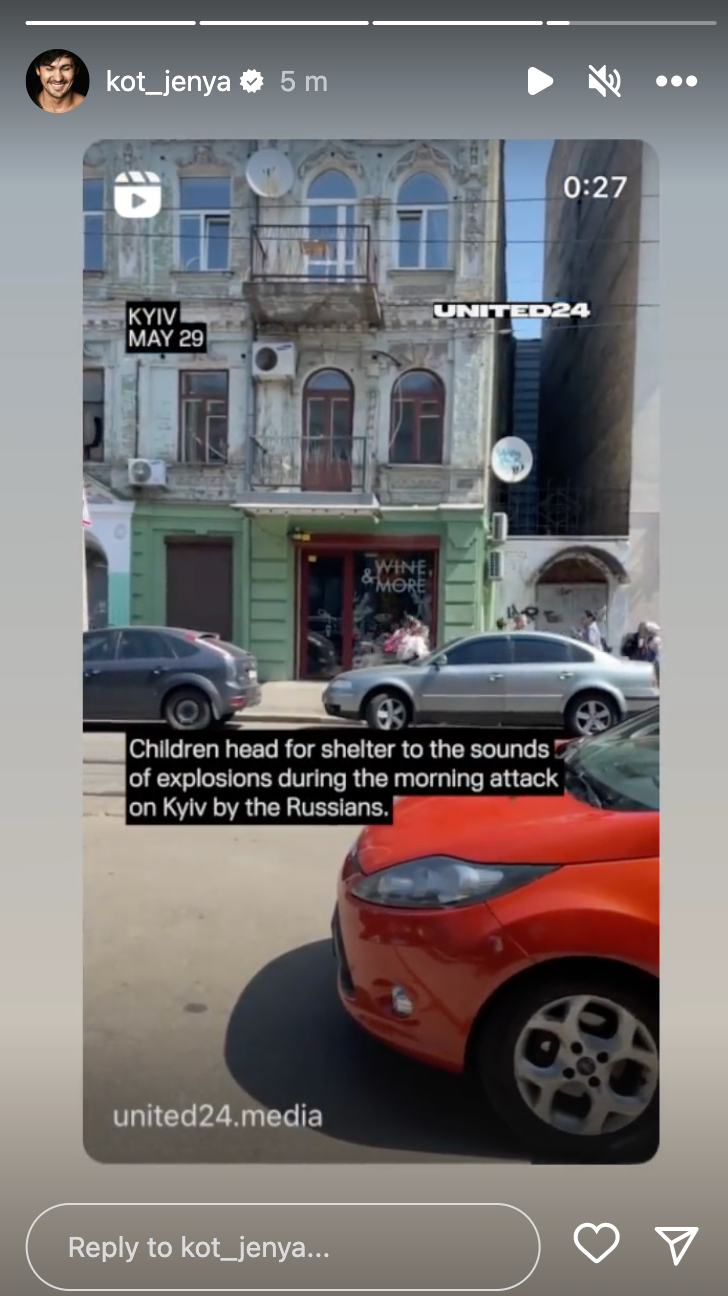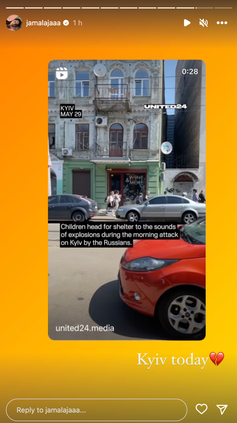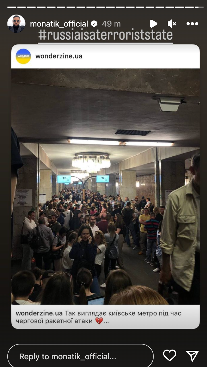 Інші українські артисти теж відреагували на чергову ракетну атаку вдень 29 травня. У своїх соцмережах вони опублікували сторіс з подякою ППО та поширили відео з дітьми, які бігли до укриття.