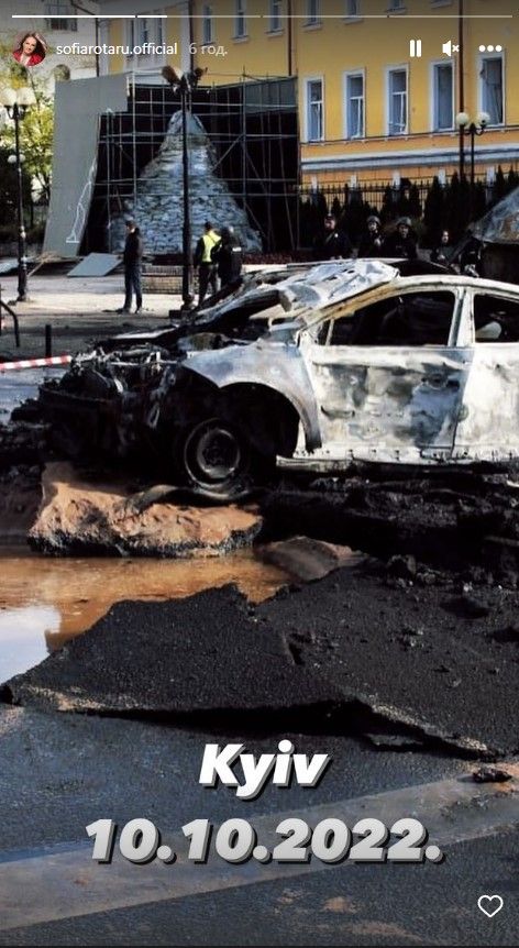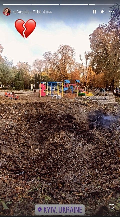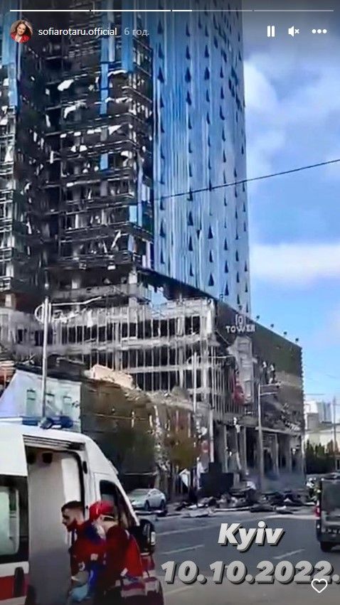 Артистка опублікувала 4 інстаграм-сторіс з кадрами з Києва, де начебто перебувала на початку війни і нібито зараз. Вона показала пошкоджений бізнес-центр, дитячий майданчик та інші наслідки удару в місті.