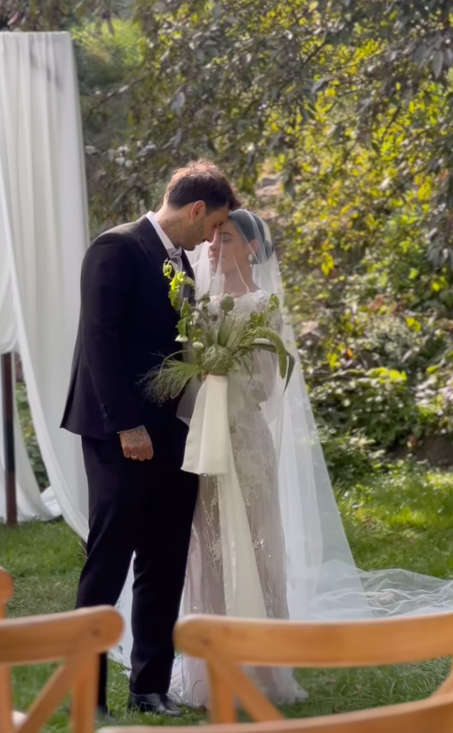 Церемонія одруження Романа Свечкоренка з коханою пройшла за містом у затишному саду. Наречені обмінялися обітницями на тлі лаконічної та стильної арки, прикрашеної легкою білою тканиною.