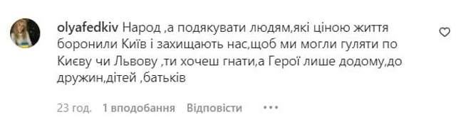 - "Народ, а подякувати людям, які ціною свого життя боронили Київ, захищають нас, щоб ми могли гуляти Києвом чи Львовом? Ти хочеш гнати, а герої – лише додому, до дружин, дітей, батьків".