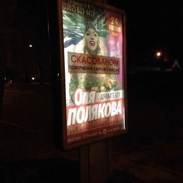 При этом по Ровно на афишах размещена реклама концерта Поляковой, уже появились наклейки с информацией об отмене концерта. Однако, официального подтверждения отмены пока нет. Кстати, билеты на концерт Оли Поляковой полностью раскупили.