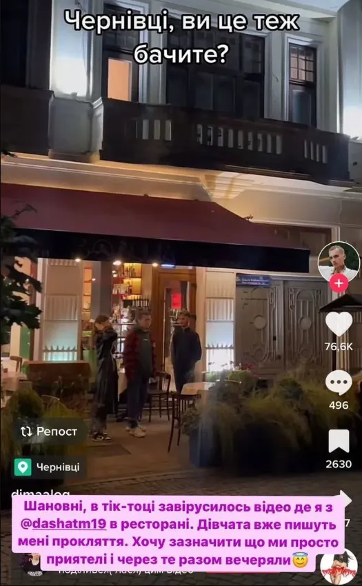 Уважаемые, в тиктоке завирусилось видео, где я с Дашей в ресторане. Девушки уже пишут мне проклятие. Хочу отметить, что мы просто приятели и поэтому вместе ужинали,