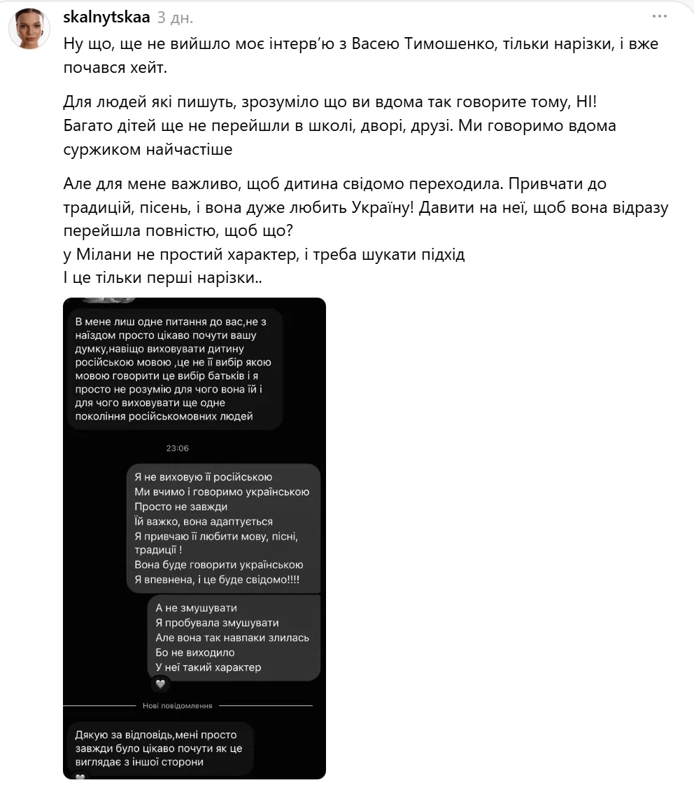 На своей странице в Threads Анастасия дополнительно объяснила, что для нее важно, чтобы дочь сознательно выбрала украинский язык. Она говорит, что приучает Милану к традициям, украинской музыки, но старается на дочь не давить.