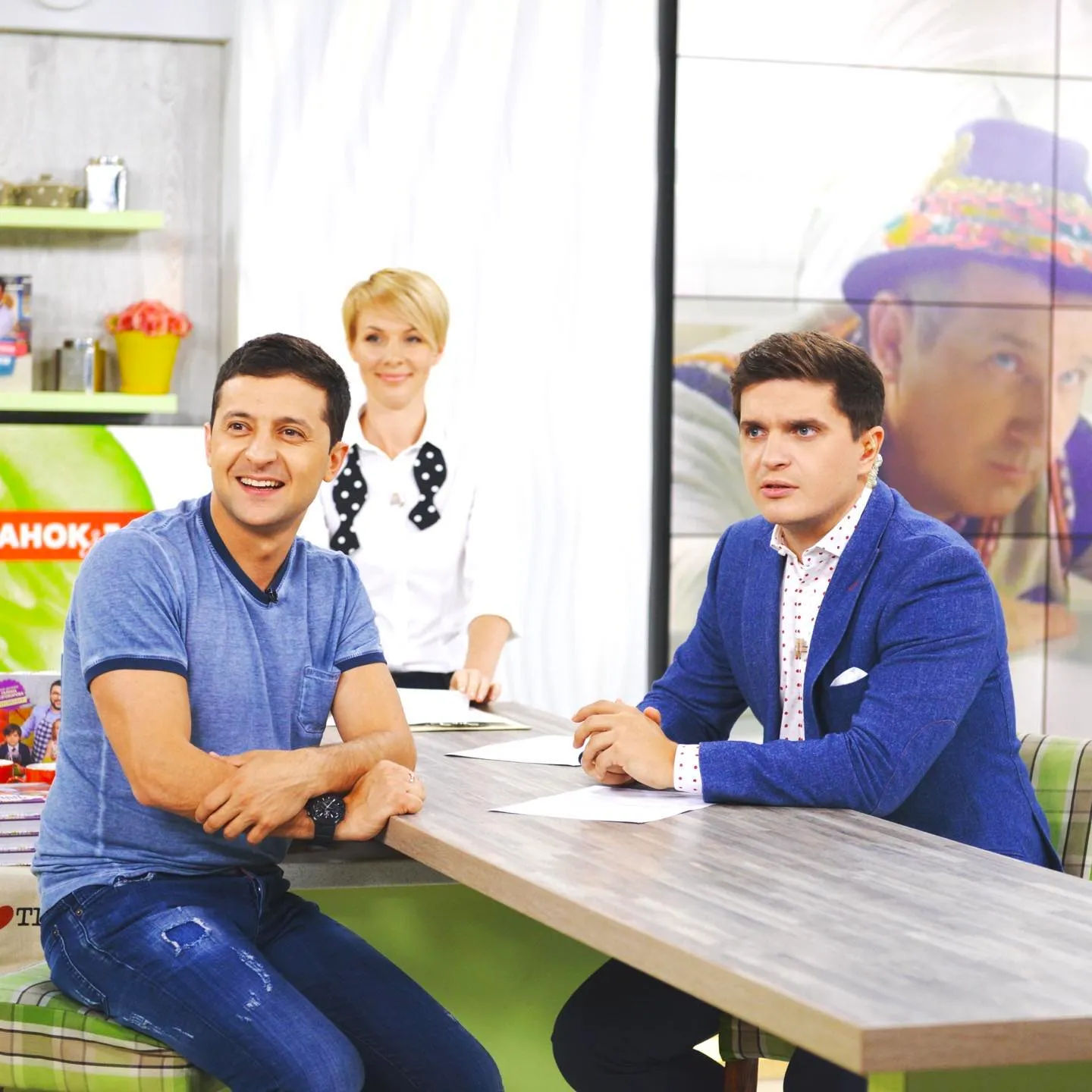 Эту фотографию Анатолий Анатолич сделал в студии утреннего шоу, позирует за столом в синем костюме. Рядом с ним – Владимир Зеленский, одетый в футболку и джинсы, без бороды и усталости в глазах.