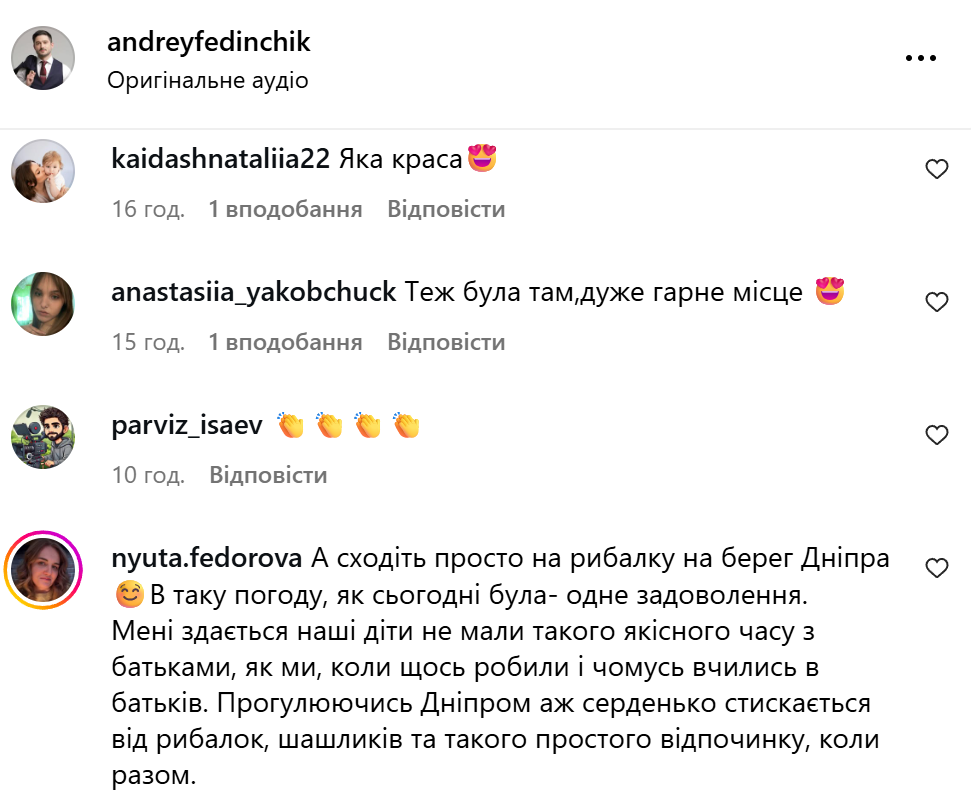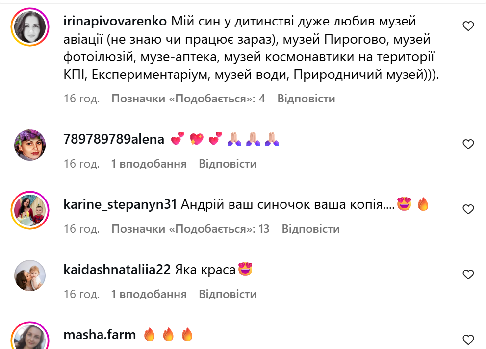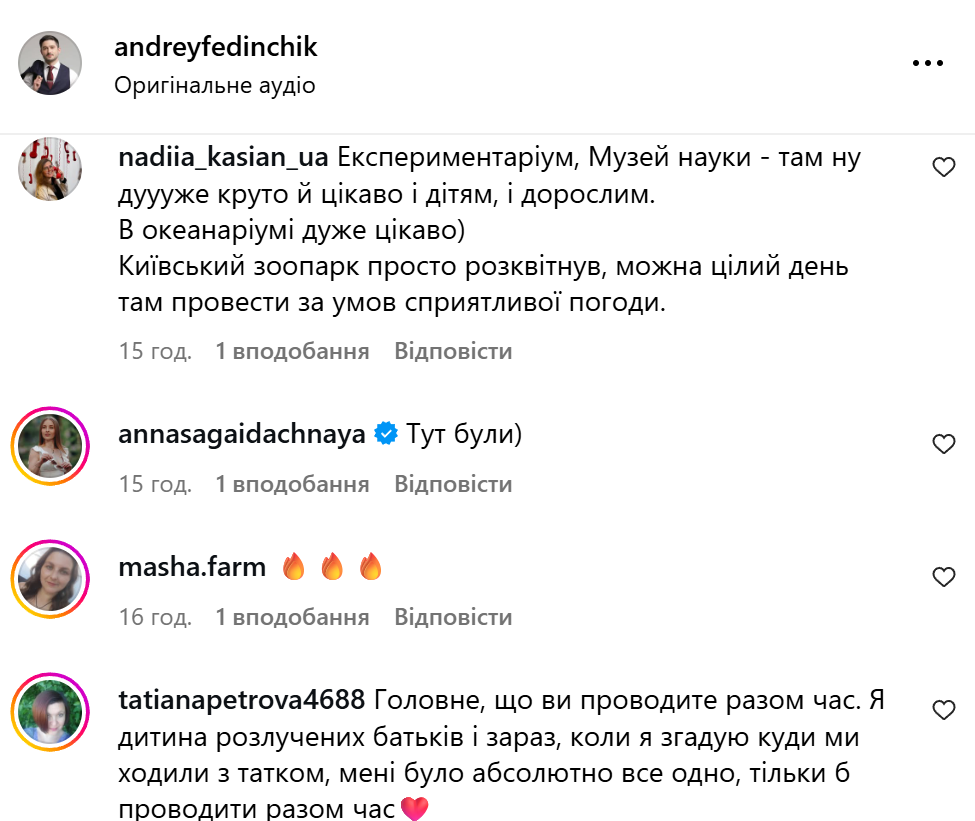 Под роликом Фединчик поинтересовался, куда другие родители водят своих детей и имеют ли они любимые места для отдыха. Подписчики написали немало рекомендаций: Экспериментариум, океанариум, зоопарк, рыбалка на берегу Днепра, музей фотоиллюзий, музей-аптека, музей космонавтики, музей воды, Природоведческий музей, аквапарк, боулинг и многое другое.