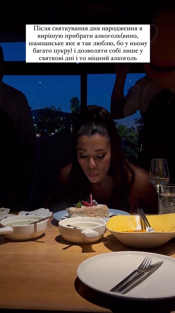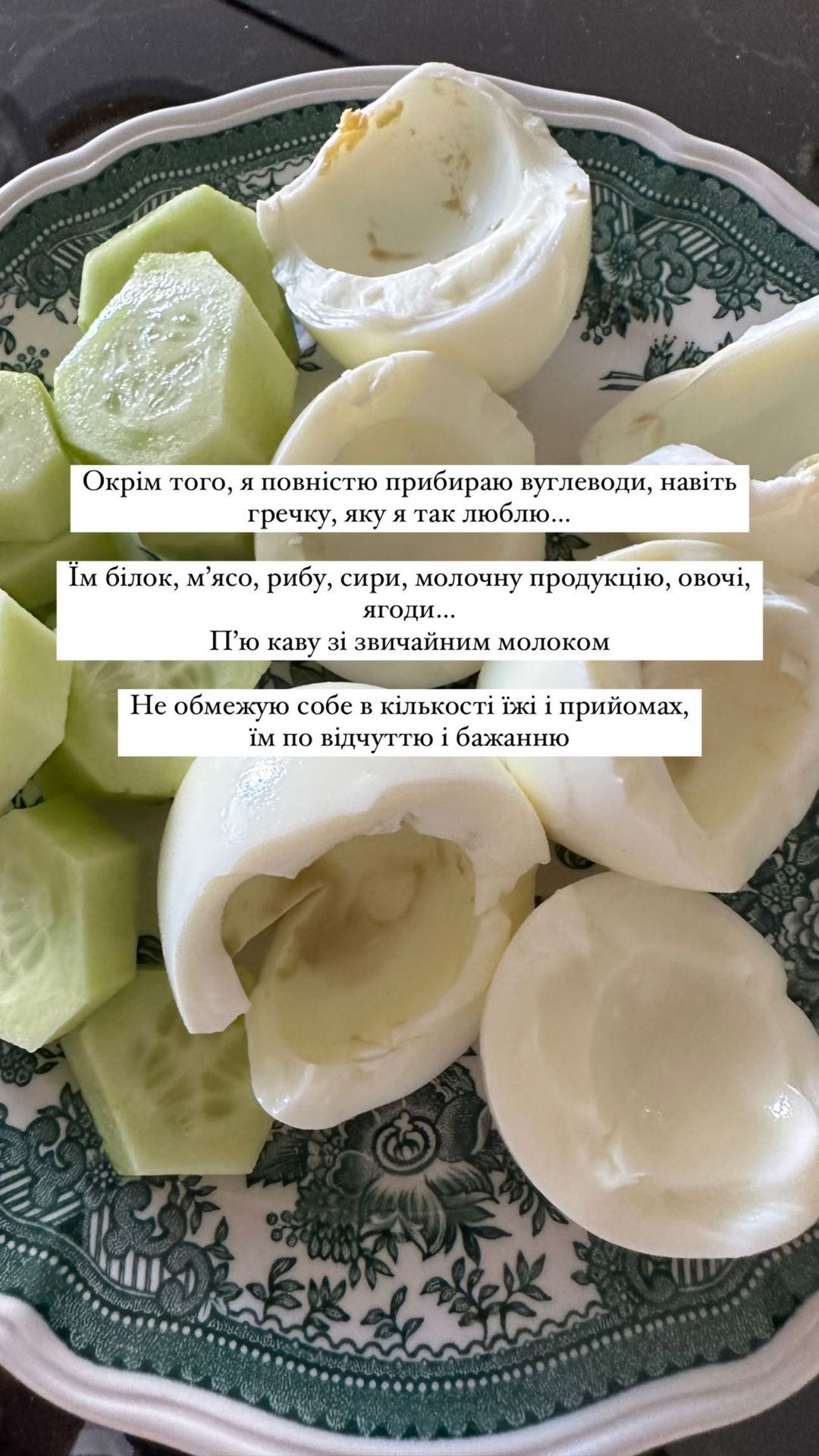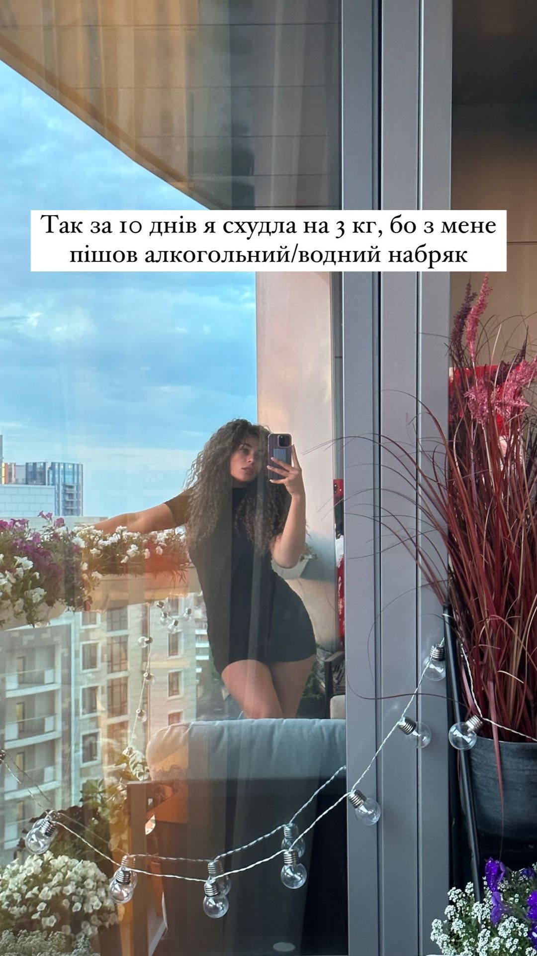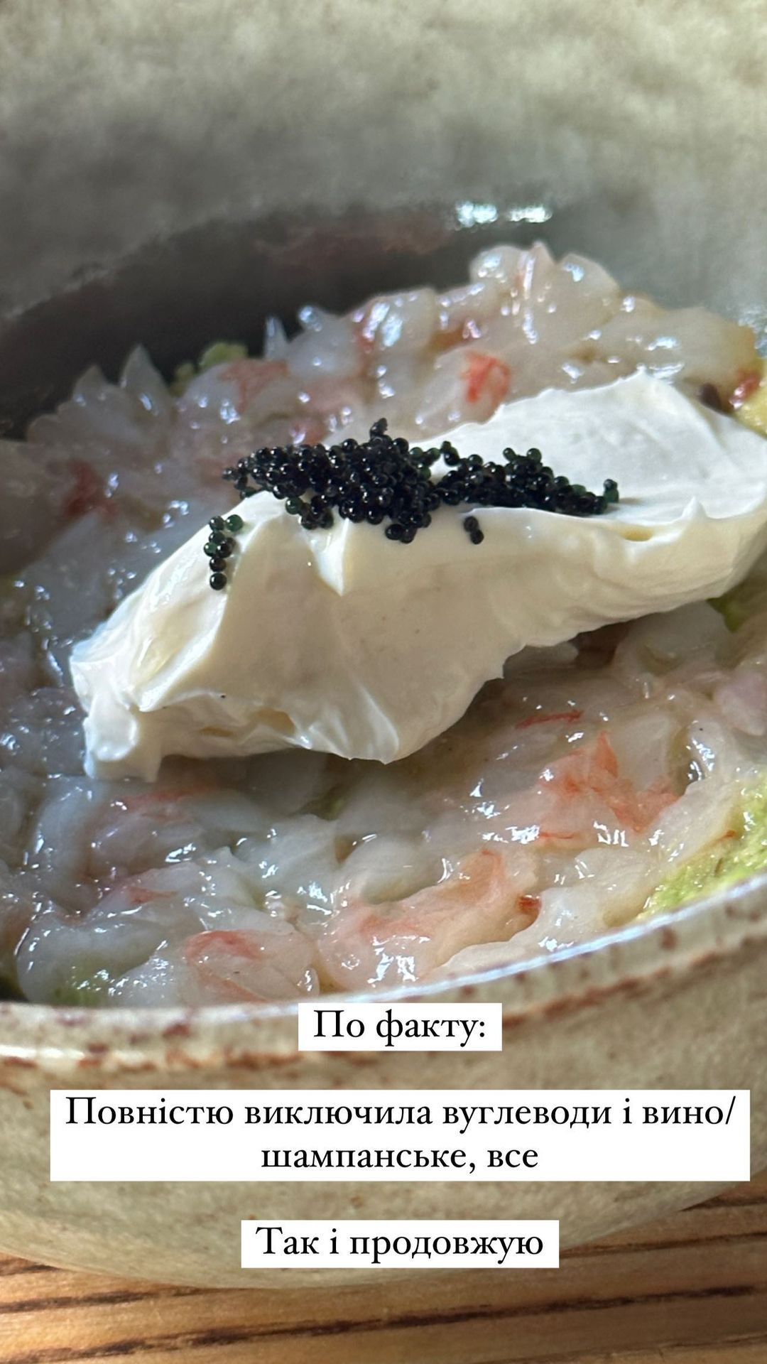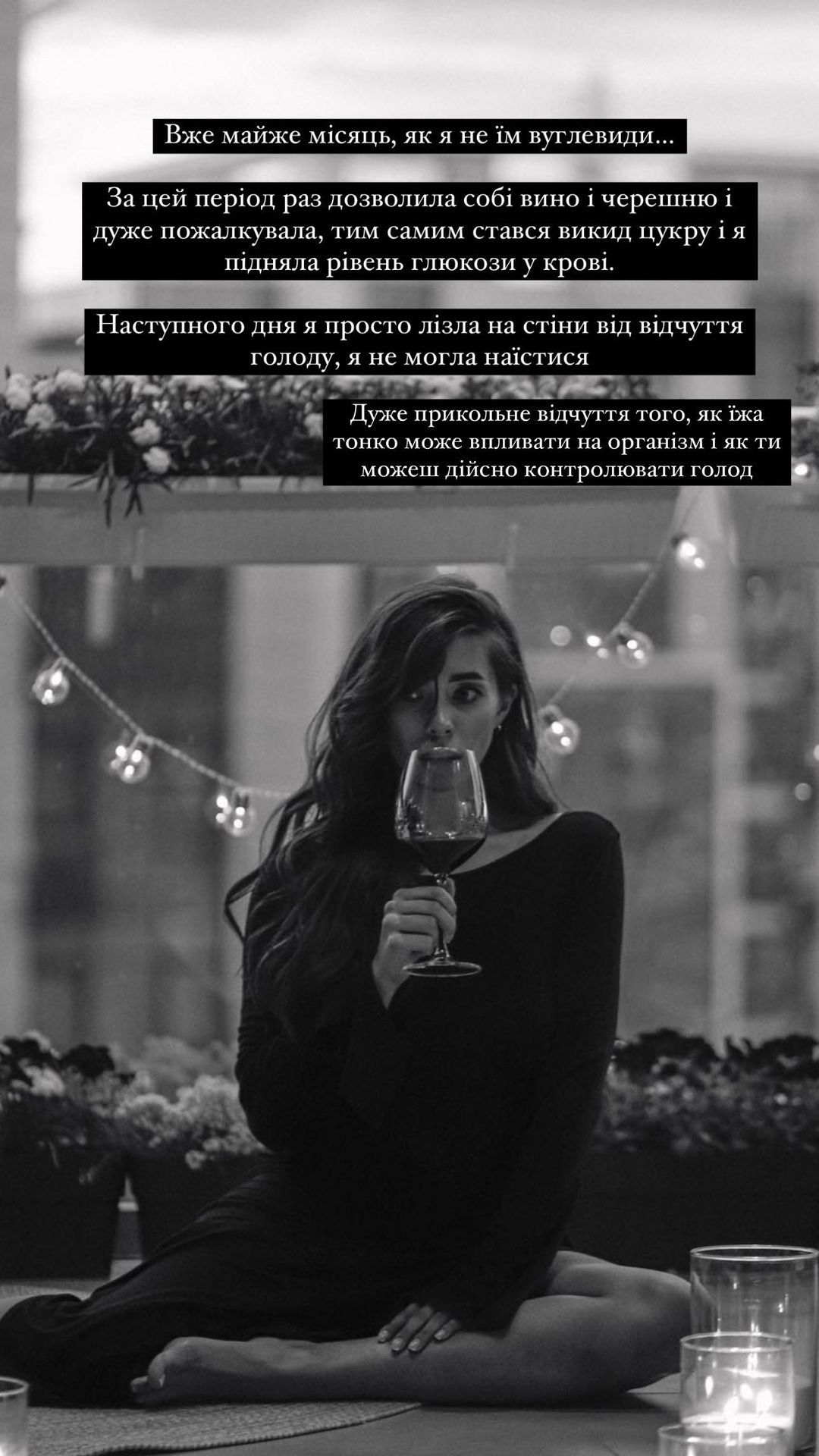 "Да за 10 дней я похудела на 3 килограмма, потому что из меня ушел алкогольный, водный отек. Уже почти месяц, как я не ем углеводы. Очень прикольное чувство того, как еда тонко может влиять на организм и как ты можешь действительно контролировать голод. По факту: полностью исключила углеводы и вино, шампанское, все".