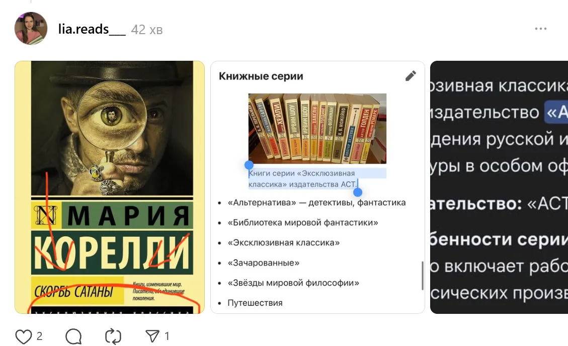 Добавим, что книга, которую заказали Анне Тринчер, входит в серию "Эксклюзивная литература" от издательства "АСТ". На это обратила внимание в Threads пользовательница с ником Lia.reads.
