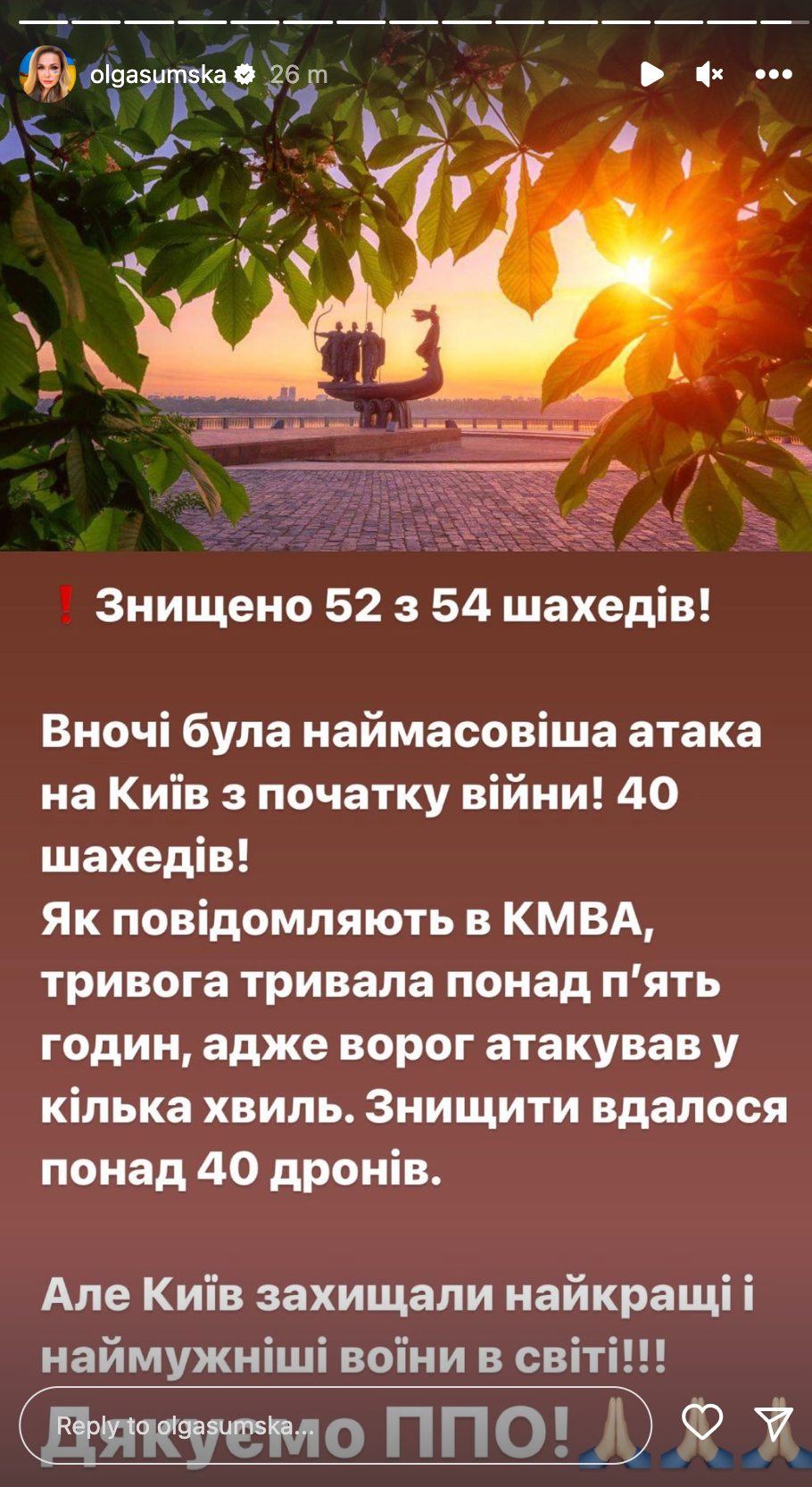 Актриса рассказала о ночной атаке в посте с поздравлением Киева с Днем города. Звезда рассказала, что тревога продолжалась 5 часов, все были в укрытии и не спали.