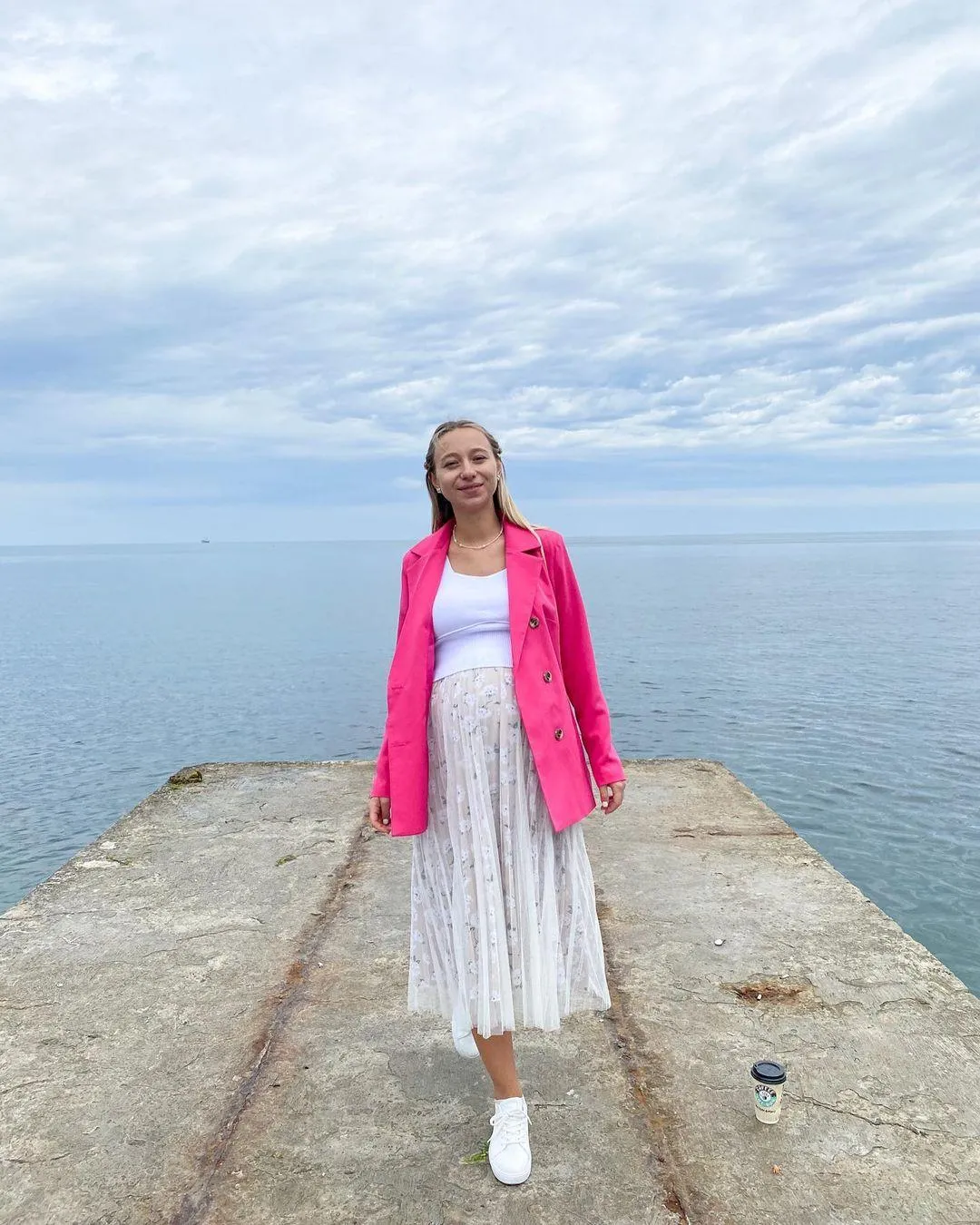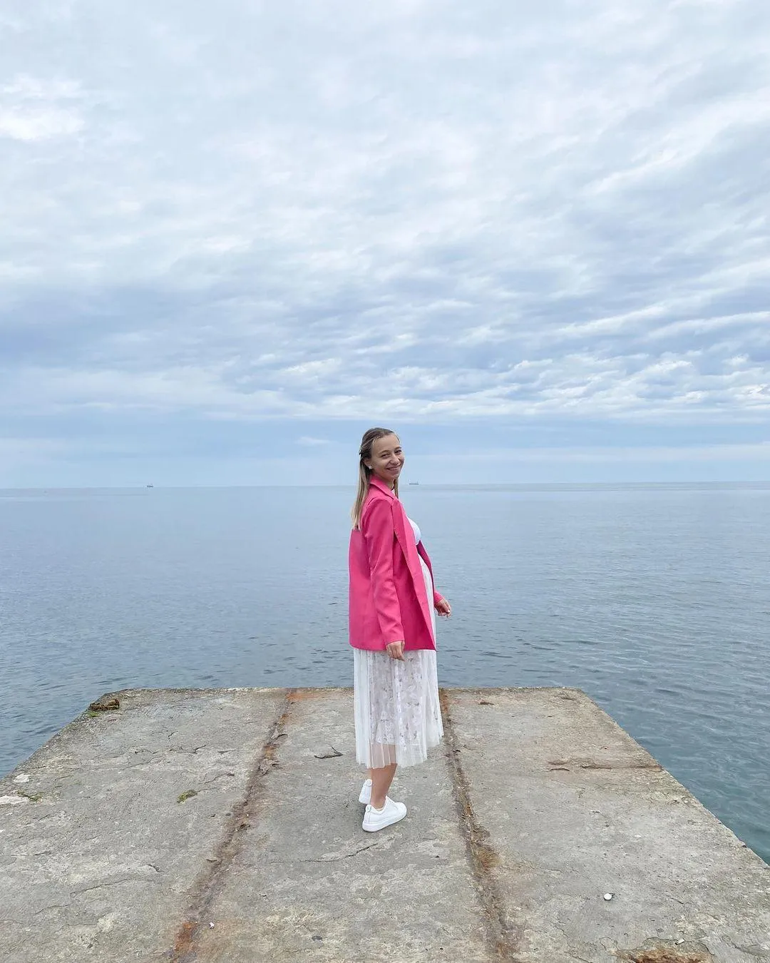 Беременная жена артиста сделала фотографии на фоне моря. Она позировала перед камерой в белом топе и плиссированной юбке с цветочным принтом, подчеркнув довольно большой живот. Сверху Катерина накинула ярко-розовый жакет, а наряд соединила с белыми кедами.