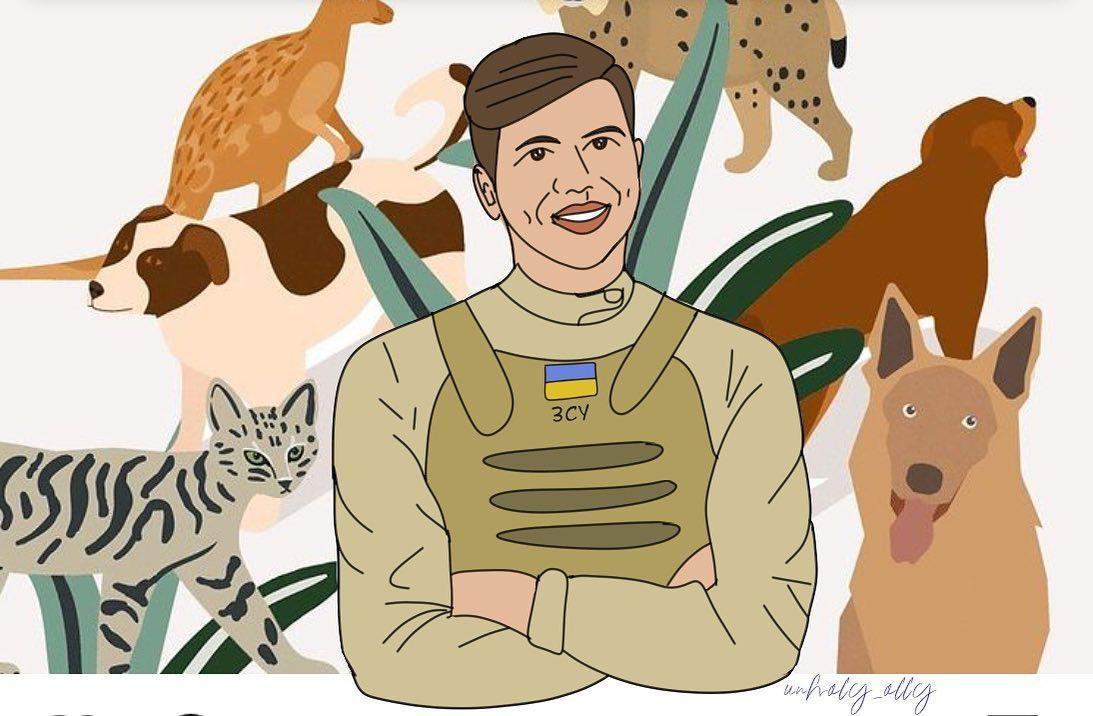 Команда также создала в честь этого события теплую иллюстрацию, где Александр в плитоноске ВСУ стоит среди четырехлапых друзей и искренне улыбается.