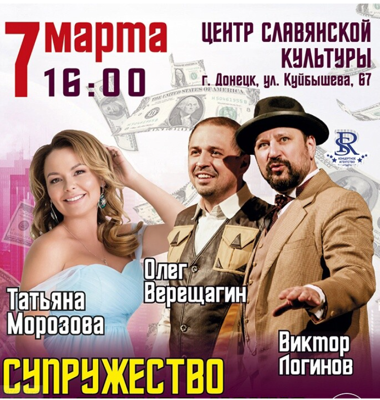 В Украину один за другим возвращаются гастролеры, а за ними едут российские знаменитости. Так, Виктор Логинов, Олег Верещагин и Татьяна Морозова из Comedy Woman собрались развлекать украинцев в оккупированном Донецке. Их спектакль "Супружество" состоится 7 марта в 16:00 в Центре славянской культуры.
