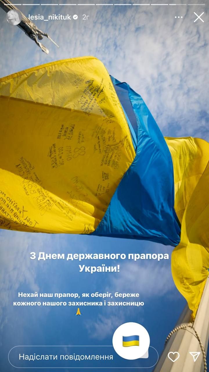 "Наш флаг — это воплощение нашей истории, достоинства и независимости. Пусть его желто-синий флаг всегда летит высоко, символизируя мужество, единство и гордость нашего народа. Желаю всем патриотизма, силы духа и стойкость веры в будущее нашей страны", — написала под публикацией NK.
