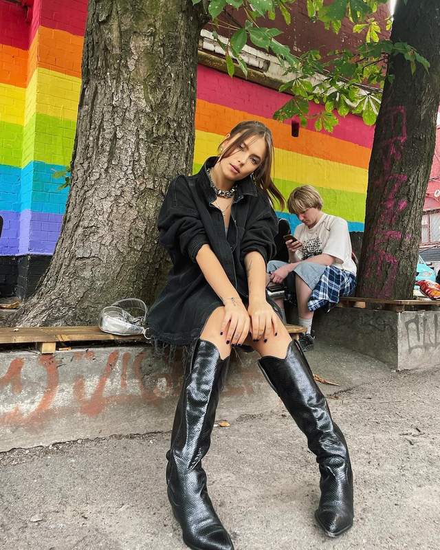 Мария опубликовала несколько фото, на которых запечатлена на фоне здания с изображением ЛГБТ-флага. Для прогулки по Киеву девушка надела короткие джинсовые шорты, серый топ и черную oversize рубашку, которую не застегивала. Соединила такую одежду с длинными черными сапогами, которые одолжила у мамы.