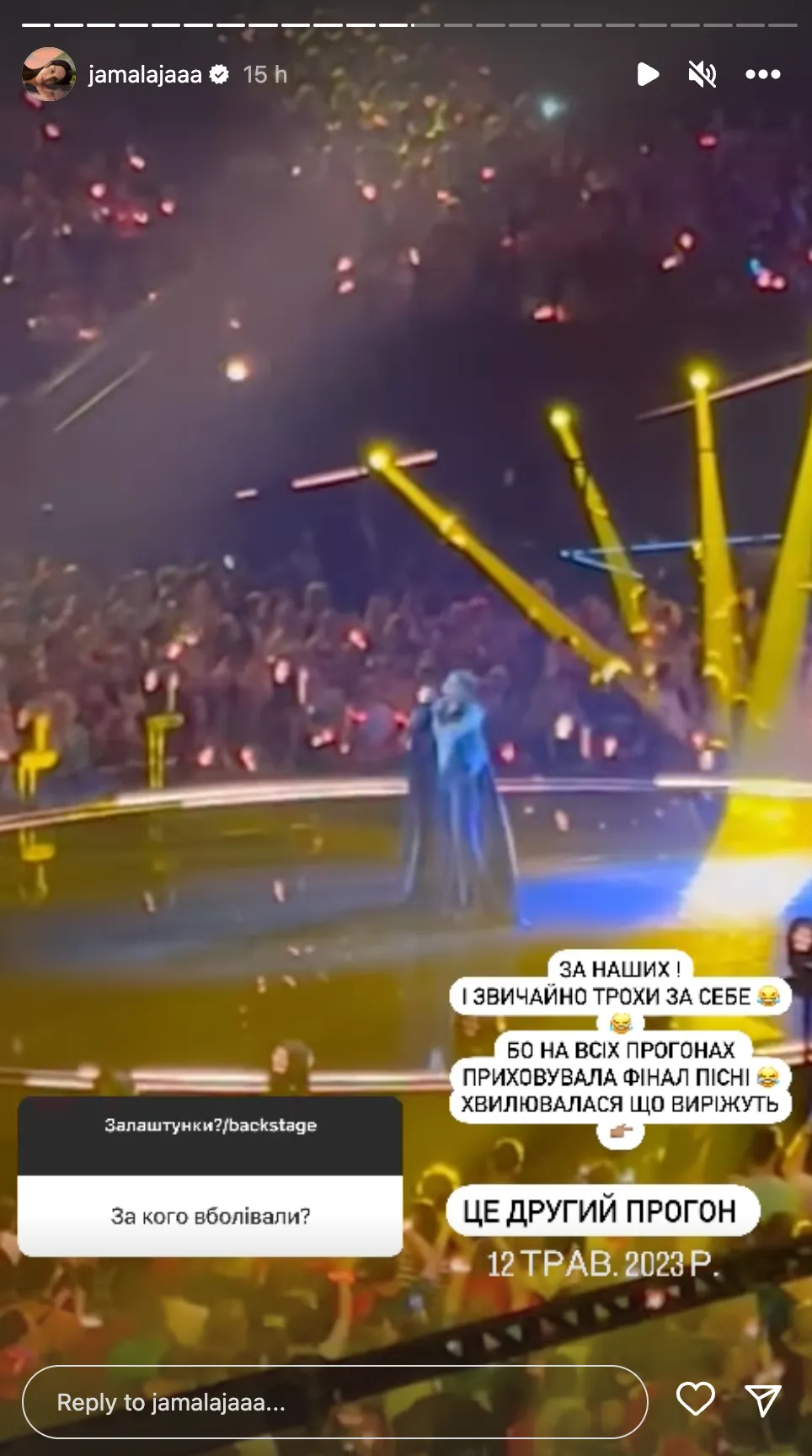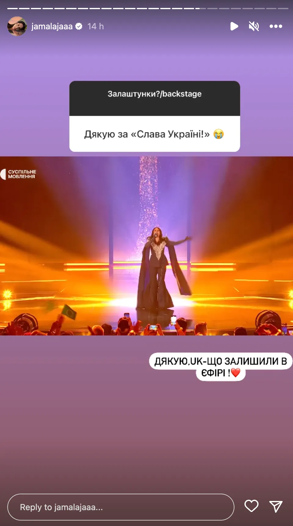Уже после завершения Евровидения исполнительница рассказала подписчикам в Instagram, каким был ее план. Оказалось, что Джамала просто очень хотела поддержать Украину, но боялась, что эту часть вообще вырежут из эфира.