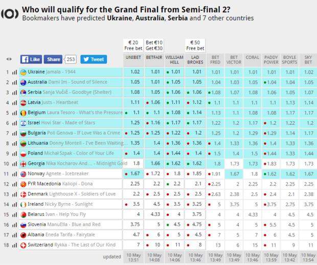 Прогнозы букмекеров опубликовали во вторник, 10 мая, на сайте eurovisionworld.com.