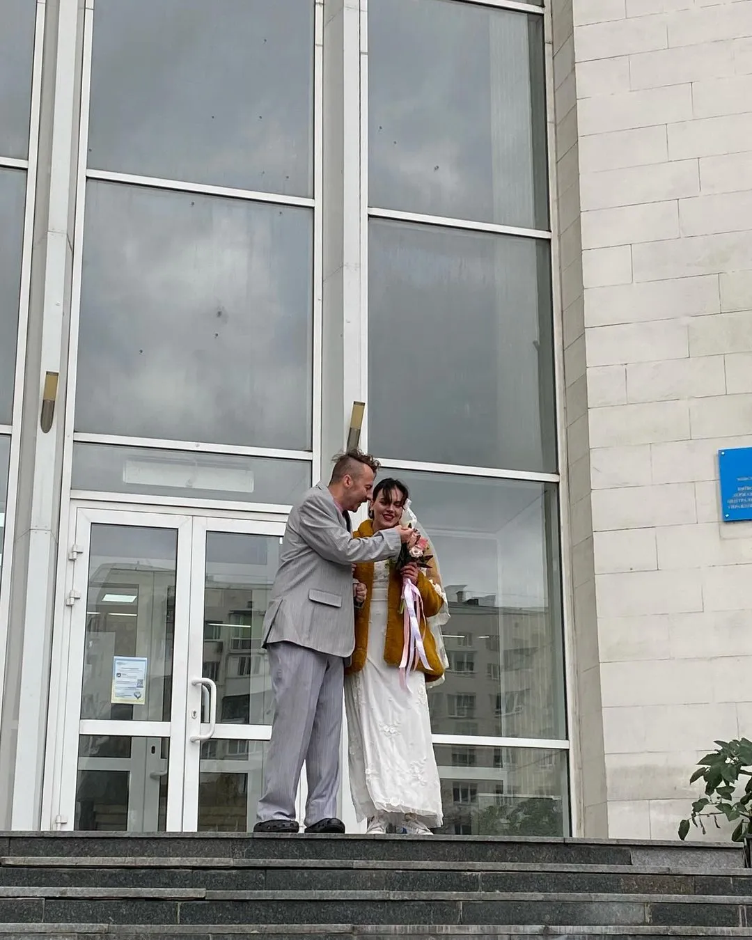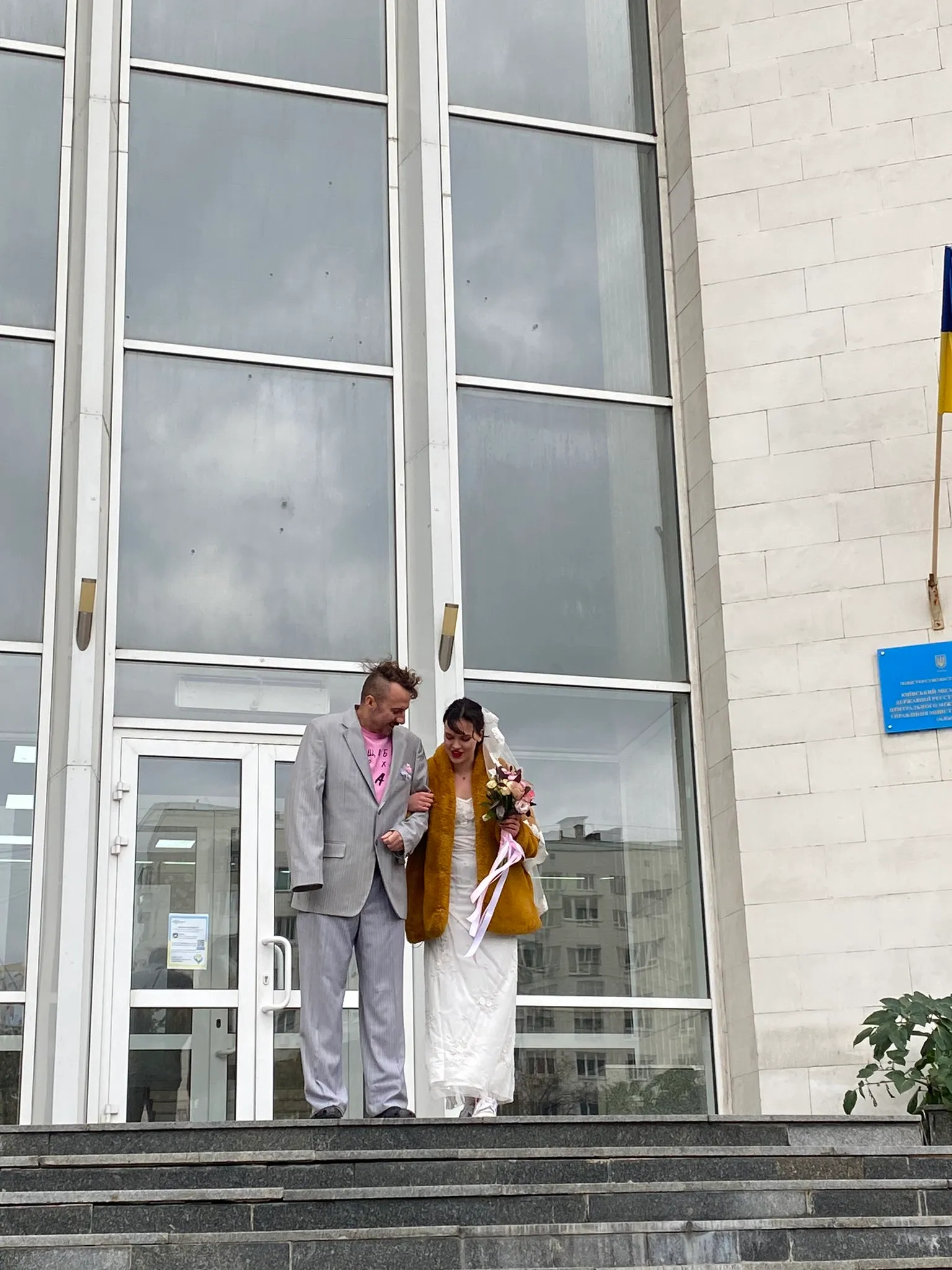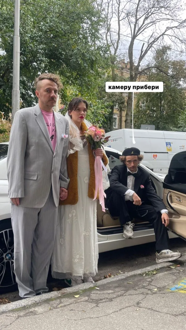 Девушка рядом с Клопотенко – Виктория Родко, солистка группы OY Sound System, участвовавшей в Национальном отборе на Евровидение-2023. Она одета в белое платье с вышивкой и пальто, свой образ дополнила фатой и букетом цветов.