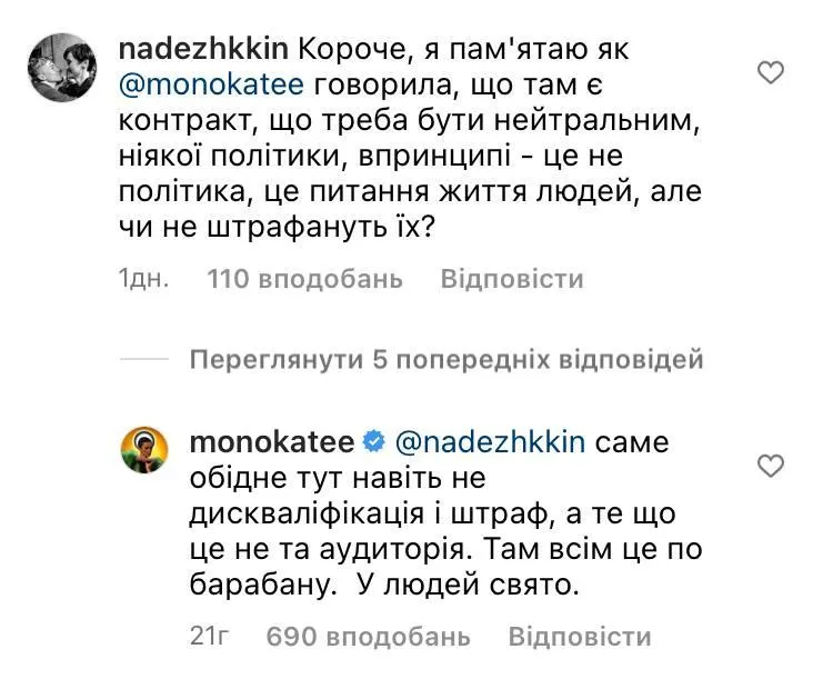 В комментариях к посту Otoy солистка группы Go_A, которая представляла Украину на Евровидении-2021, напомнила, что это аполитичный конкурс, поэтому подобные призывы не только запрещены правилами, но и неинтересны публике, которая ждет праздника.