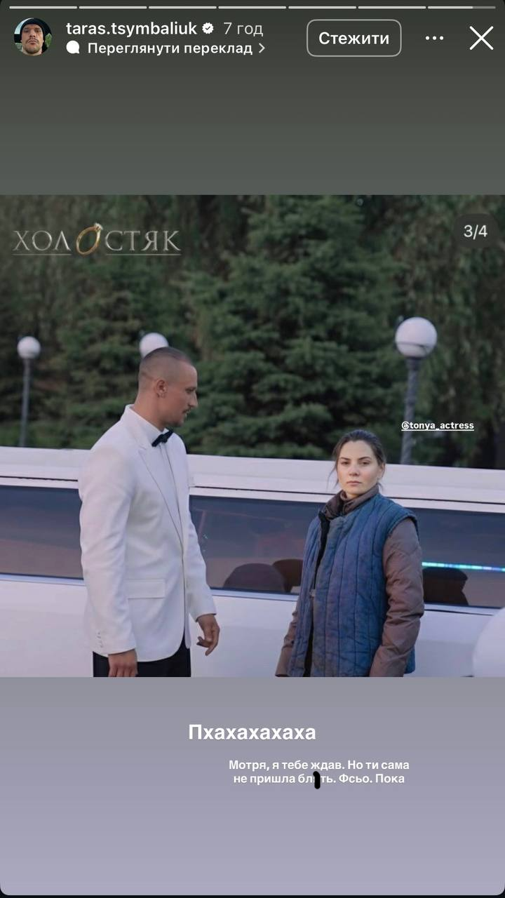 В Instagram Stories Тарас Цимбалюк распространил фото, где стоит возле белого лимузина с Антониной Хижняк, которую изобразили в образе Мотри. Именно на этом авто участницы "Холостяка" приезжали на знакомство с главным героем.