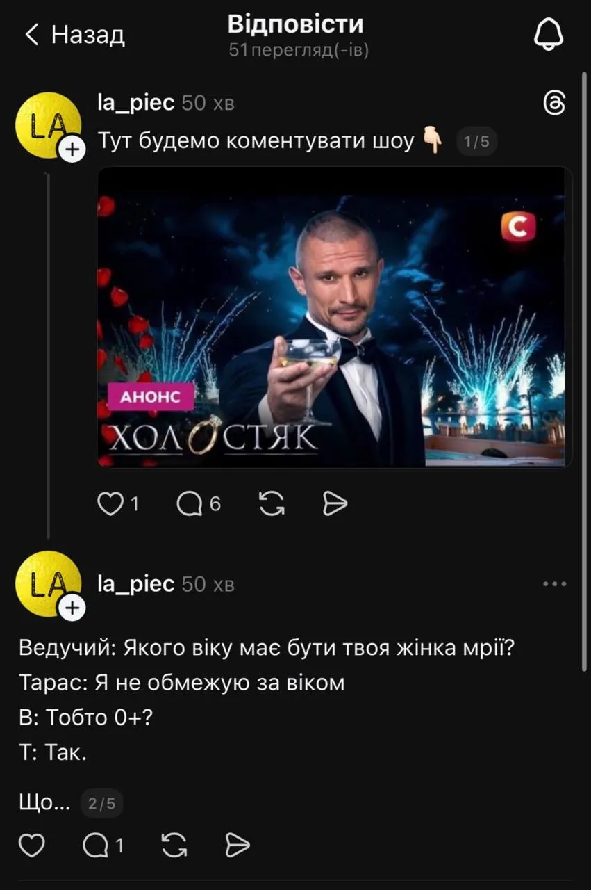 В Threads не утихают обсуждения нового сезона "Холостяка" / Скриншот из соцсети