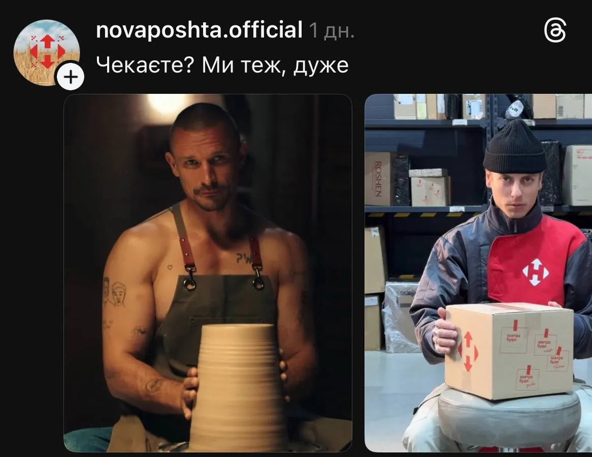 "Новая почта" также сделала остроумную публикацию, показав два изображения: Тараса Цимбалюка за гончарным кругом и работника компании, который его "копирует".
