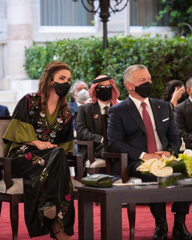 - На Дне независимости Иордании королева была в вышитом платье. Стоит отметить, что она обожает одежду с элементами вышивки. В тот день она выбрала длинное платье черного цвета, расшитое цветами, с короткими рукавами цвета хаки и лаконичным декольте. Также аутфит дополнили: обувь на каблуке, клатч, защитная маска, аккуратная прическа и идеальный макияж.