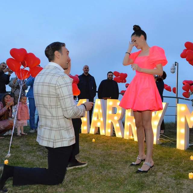 Иракли приготовил для избранницы сюрприз. Он собрал друзей и родственников на горной вершине в Тбилиси, а также украсил локацию романтическими декорациями.