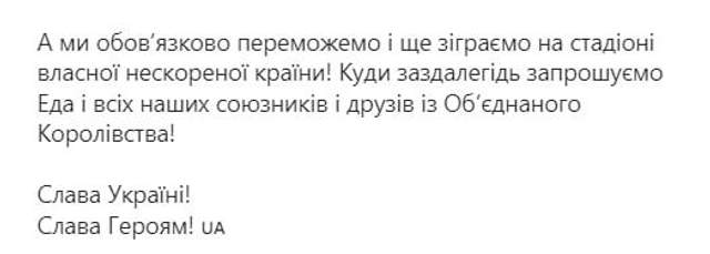 А мы обязательно победим и сыграем еще на стадионе собственной непокоренной страны! Куда заранее приглашаем Эда, всех наших союзников и друзей из Соединенного Королевства!