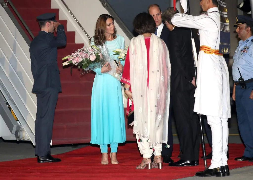 На кадре, сделанном в пакистанском аэропорту Кур-Хан, видно, как Уильям и Кейт спускаются по трапу к чиновникам, которые вышли их встречать. Символично герцоги Кембриджские стояли спиной к камере, ведь не их визит является главным в турне, а помощь жителям страны.