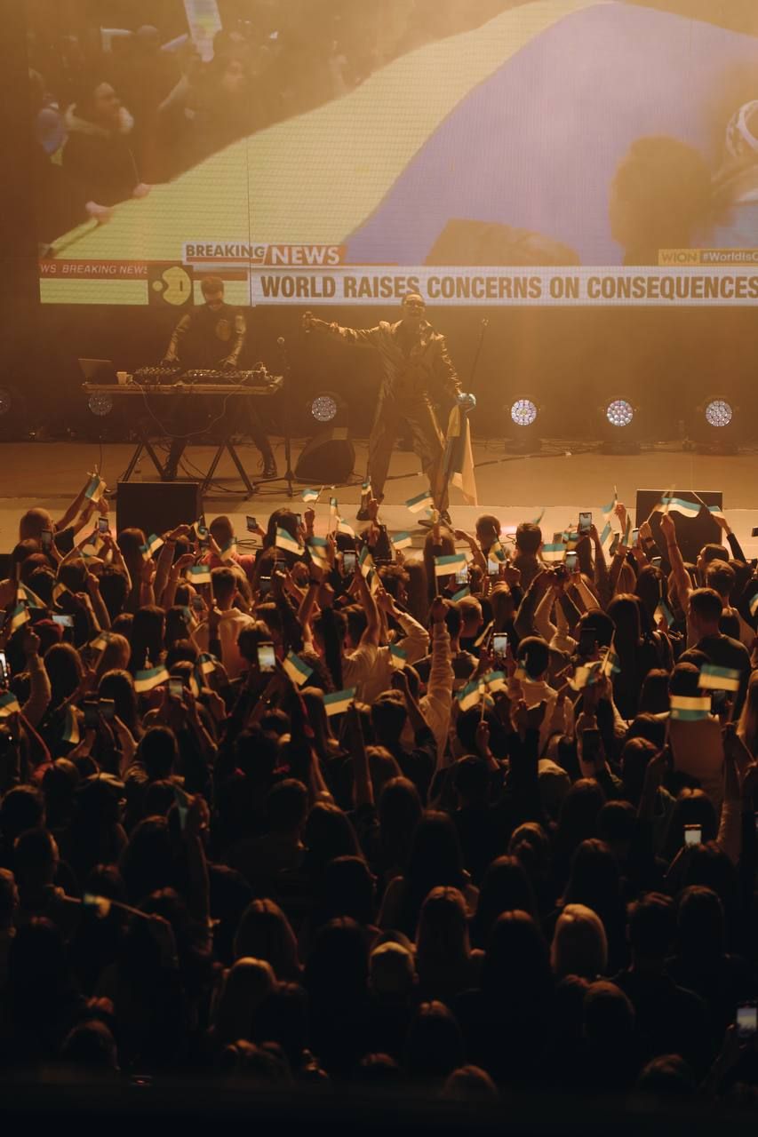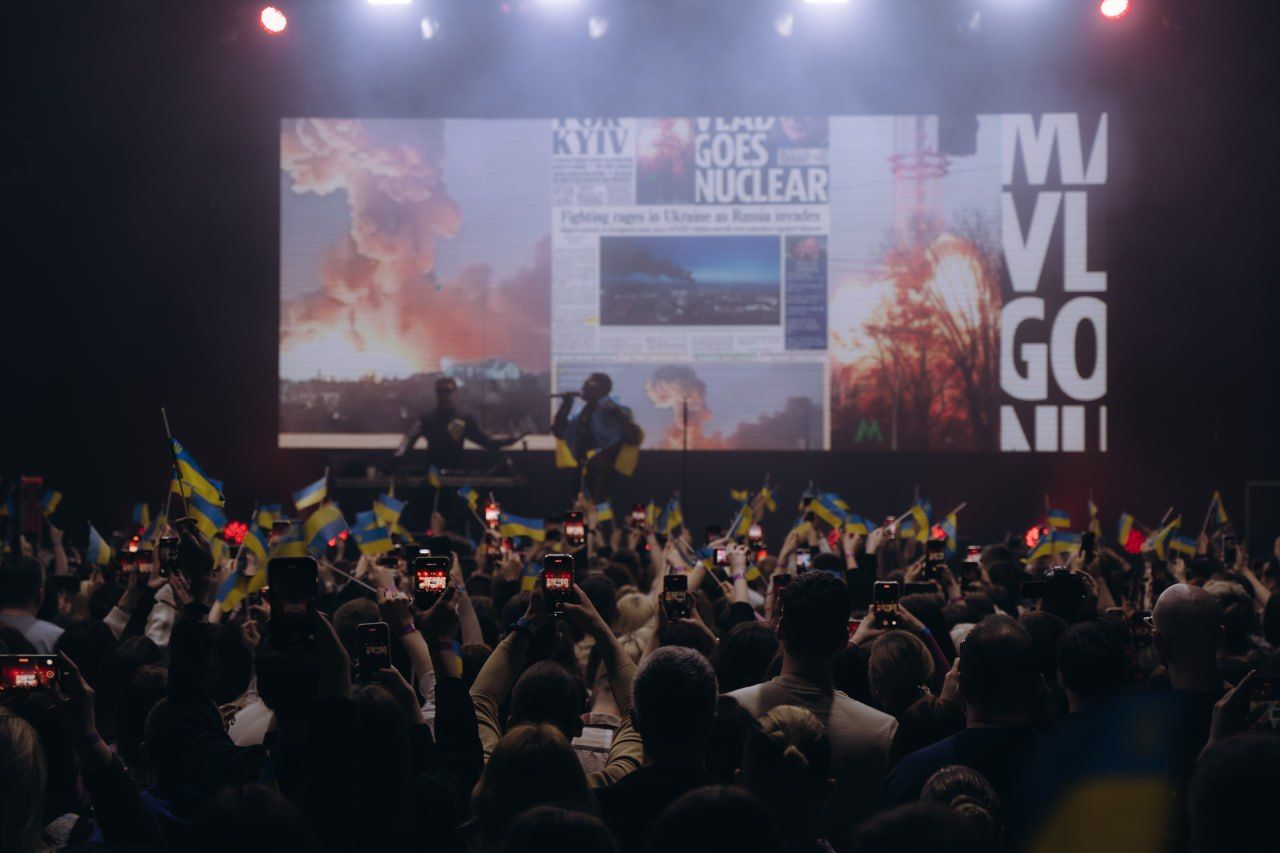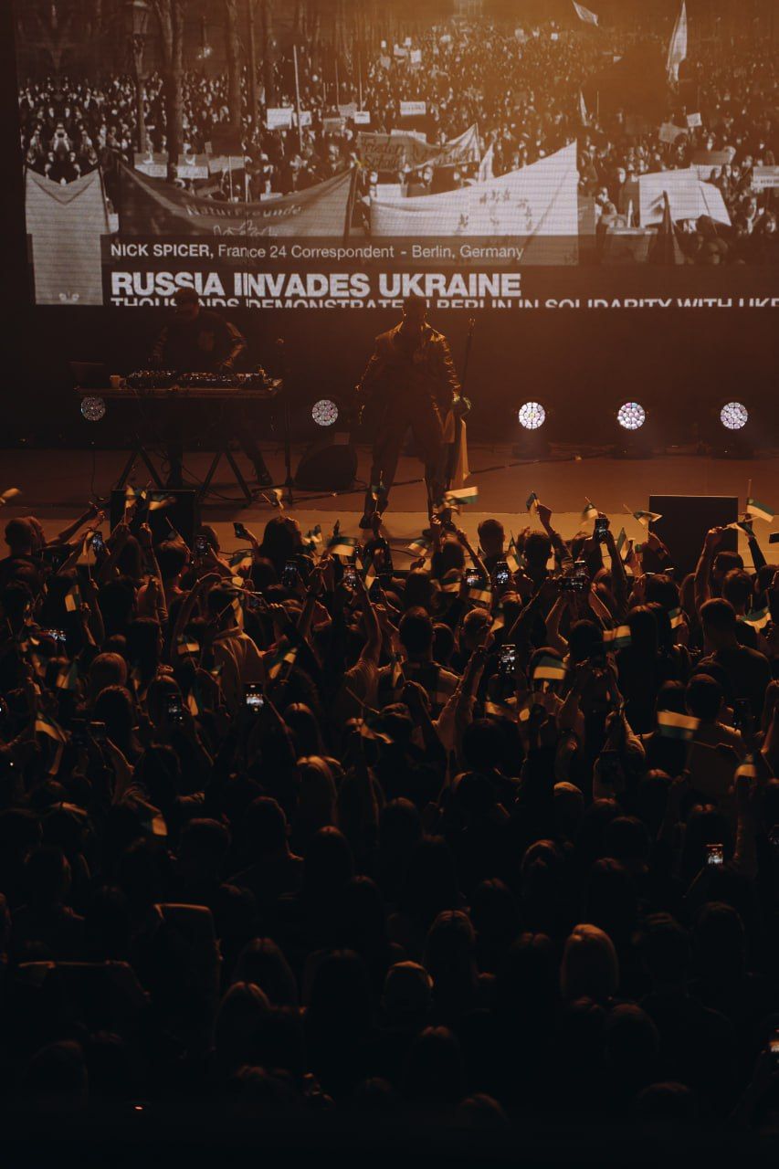 Во время трека FREEDOM о нашей свободе и борьбе за будущее, зрители устроили артистам флешмоб и подняли вверх сотни украинских флажков, чем растрогали группу.