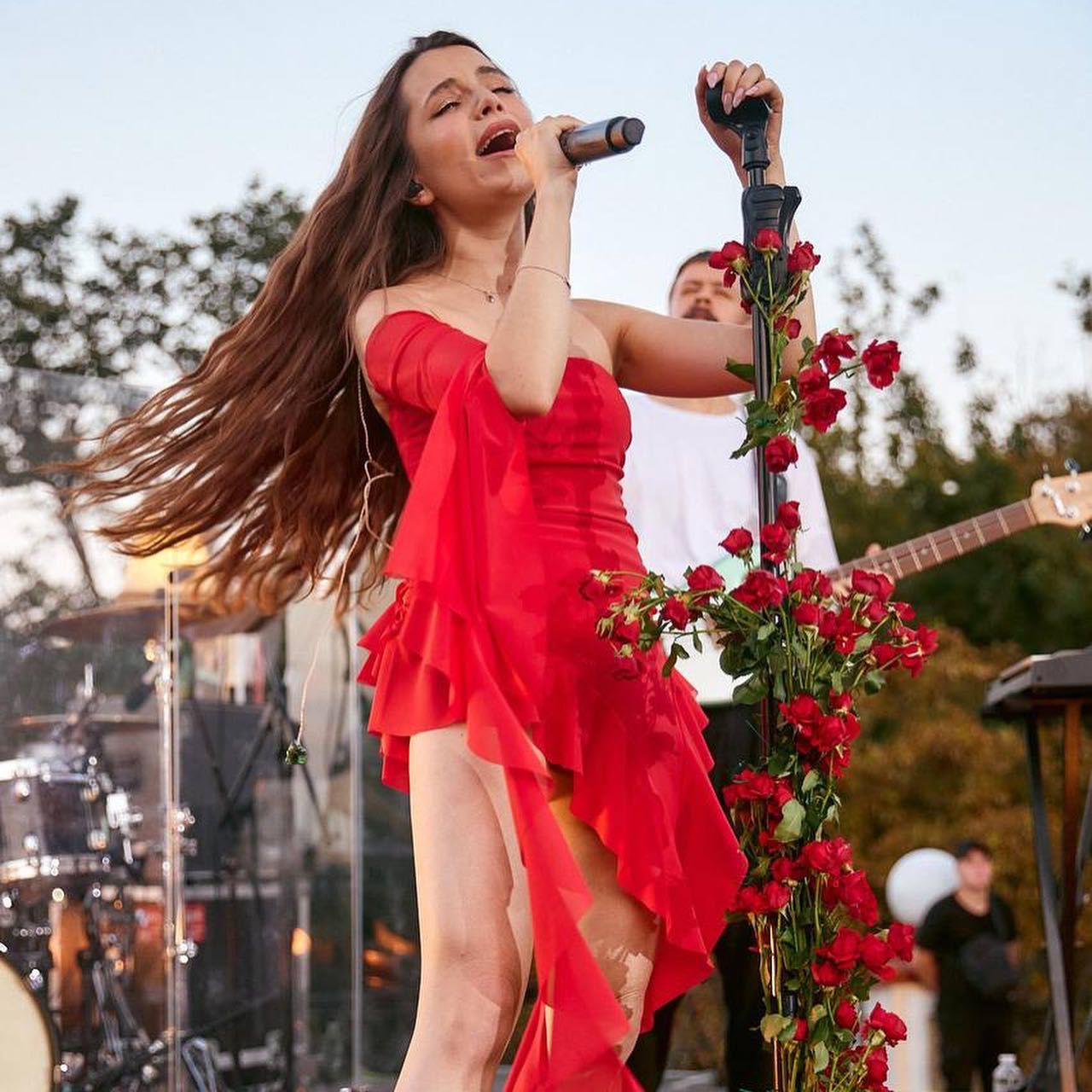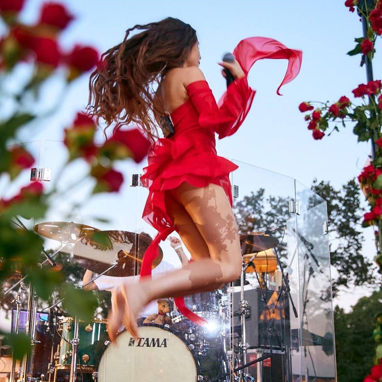 На концерт звезда выбрала яркий образ – короткое красное асимметричное платье-бюстье с воланами.