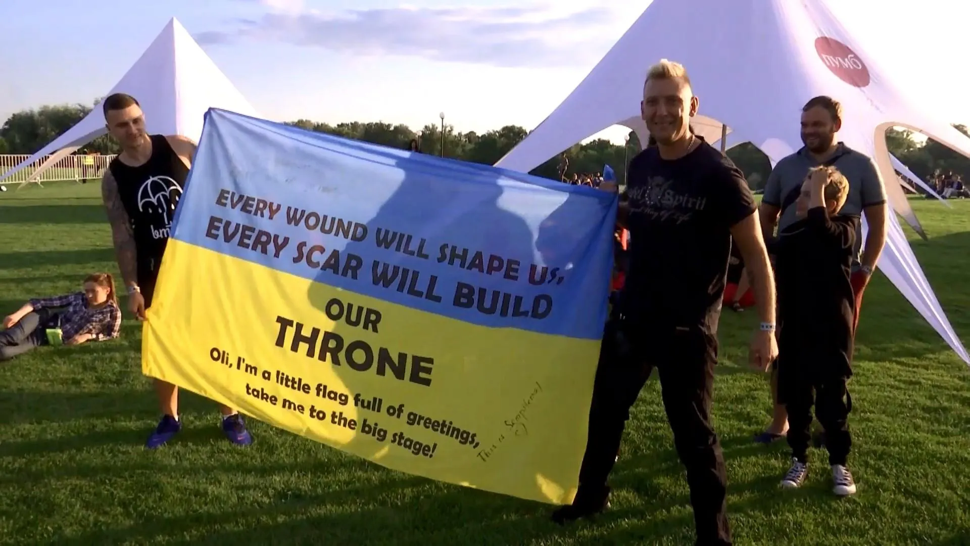 Украинские фаны решили оставить кумирам какую-то память о себе. Максим с друзьями прихватили с собой украинский флаг с отпечатанным текстом песни, чтобы подарить любимой группе.