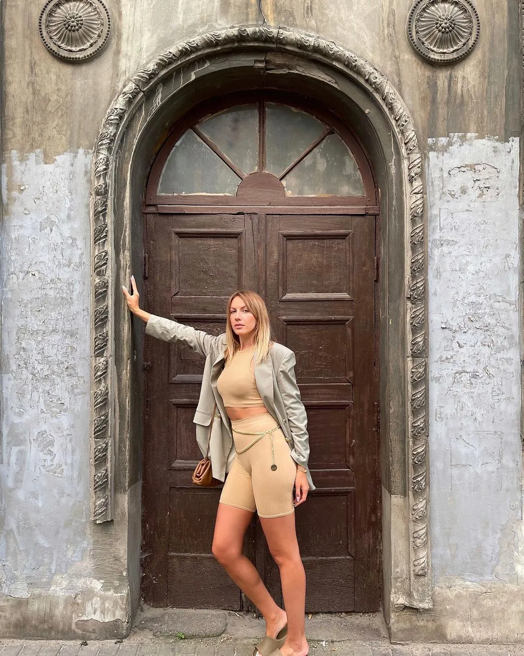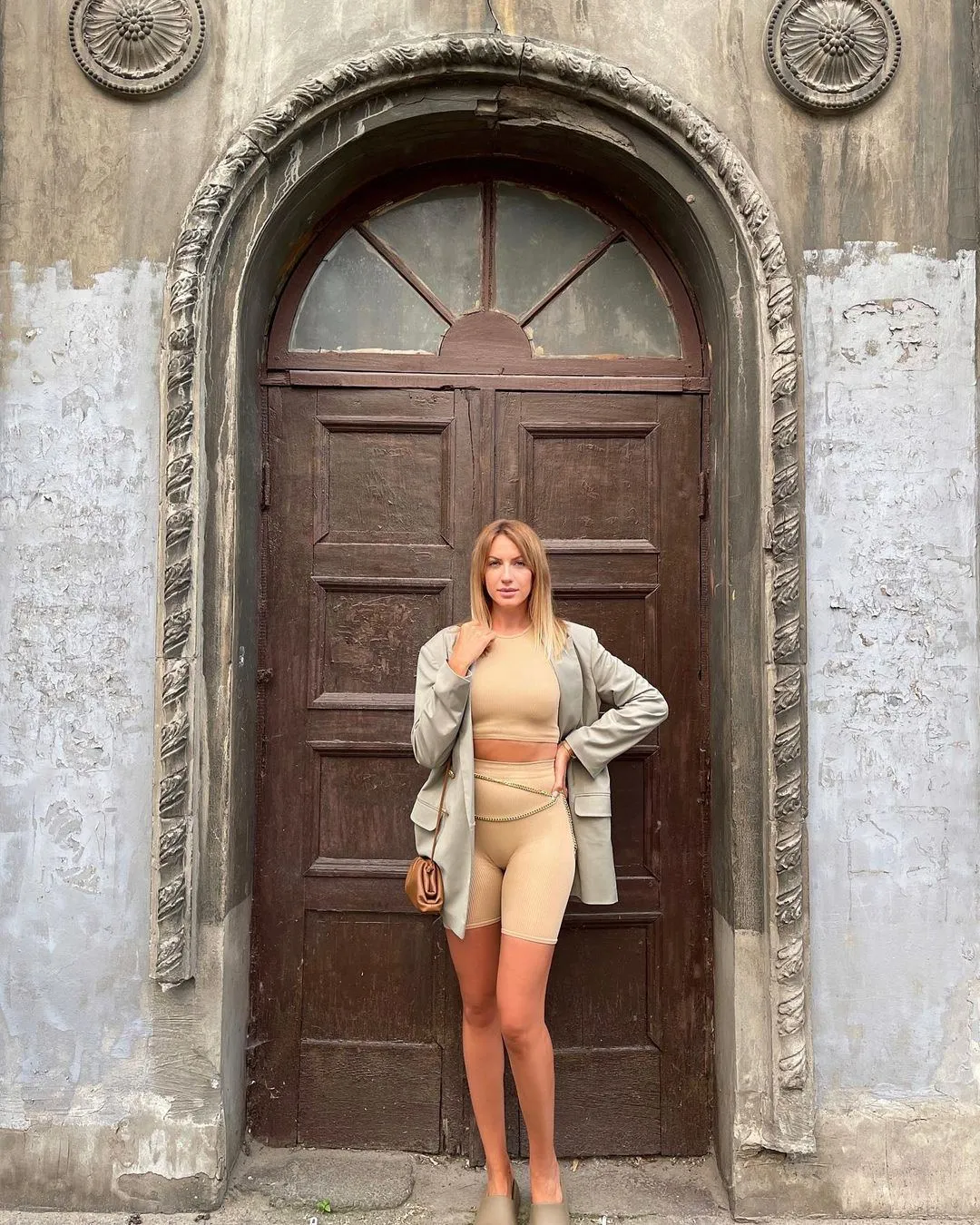 Знаменитость позировала перед камерой на фоне старинного здания. Для прогулки по Киеву Леся Никитюк выбрала удобный наряд. Она примерила бежевый костюм в обтяжку, состоящий из кроп-топа и мини-шорт с высокой посадкой.