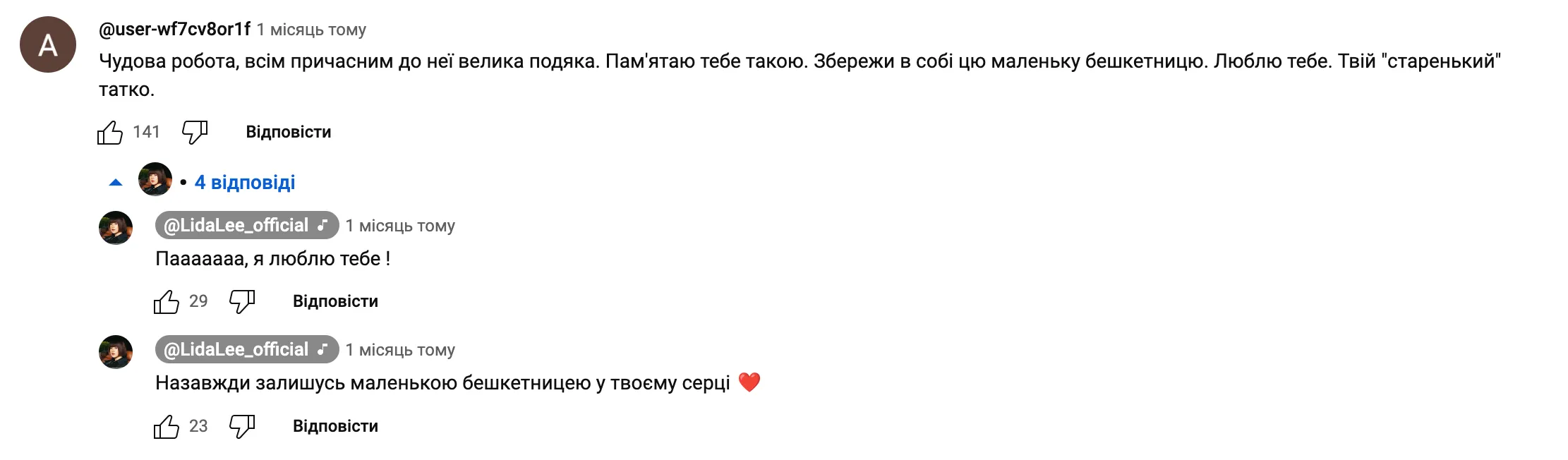 Папа Lida Lee написал в комментариях дочке / Скриншот