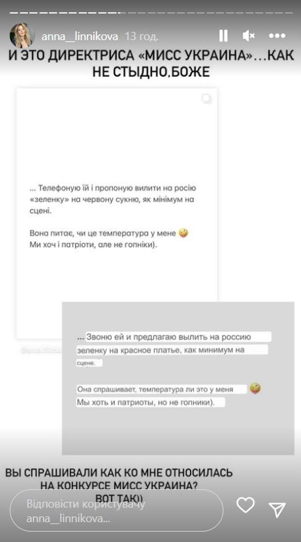 Но такие слова не понравились россияне Линниковой. Она распространила сообщение в своих сторис, чтобы россияне смогли перейти на него и оставить собственные комментарии, и написала от себя: "И это директор "Мисс Украина". Как ни стыдно, Боже. Вы спрашивали, как ко мне относилась на конкурсе "Мисс Украина"? Вот так. И эти люди давали интервью и рассказывали, какая я плохая. Посмотрите сами".