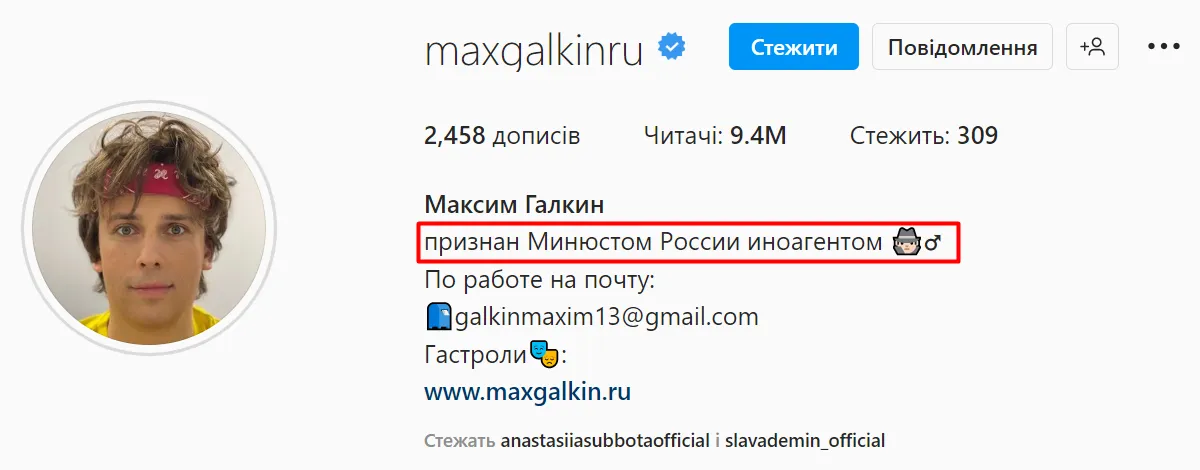 На решение министерства юстиции Максим Галкин отреагировал мгновенно. Теперь в шапке его инстаграм-профиля с 9,4-миллионной аудиторией красуется надпись: "Признан минюстом россии иноагентом".