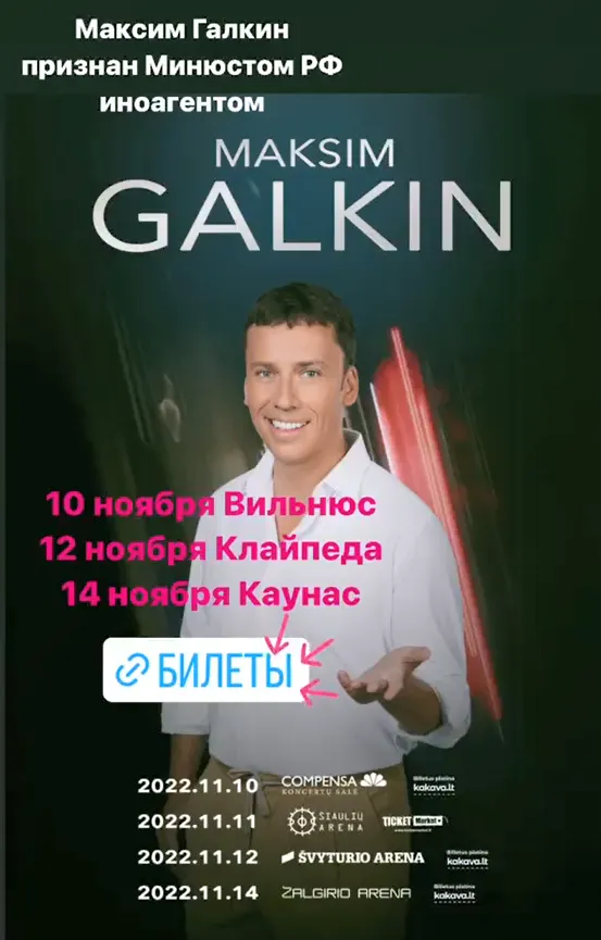 Кроме того, в инстаграм-сторис Максим Галкин опубликовал афиши своих будущих концертов в Литве – в Вильнюсе, Калайпеде, Каунасе и Шяулае. Конечно же, не забыл написать: "Максим Галкин признан минюстом рф иноагентом".