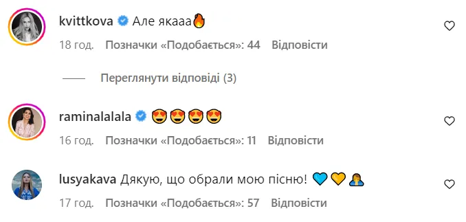 В комментариях ее образ оценили блогерша-миллионница Даша Квиткова, интервьюер Рамина Эсхакзай, а автор хита Ukrainian Girl Люся Кава поблагодарила за выбор трека: "Спасибо, что выбрали мою песню".