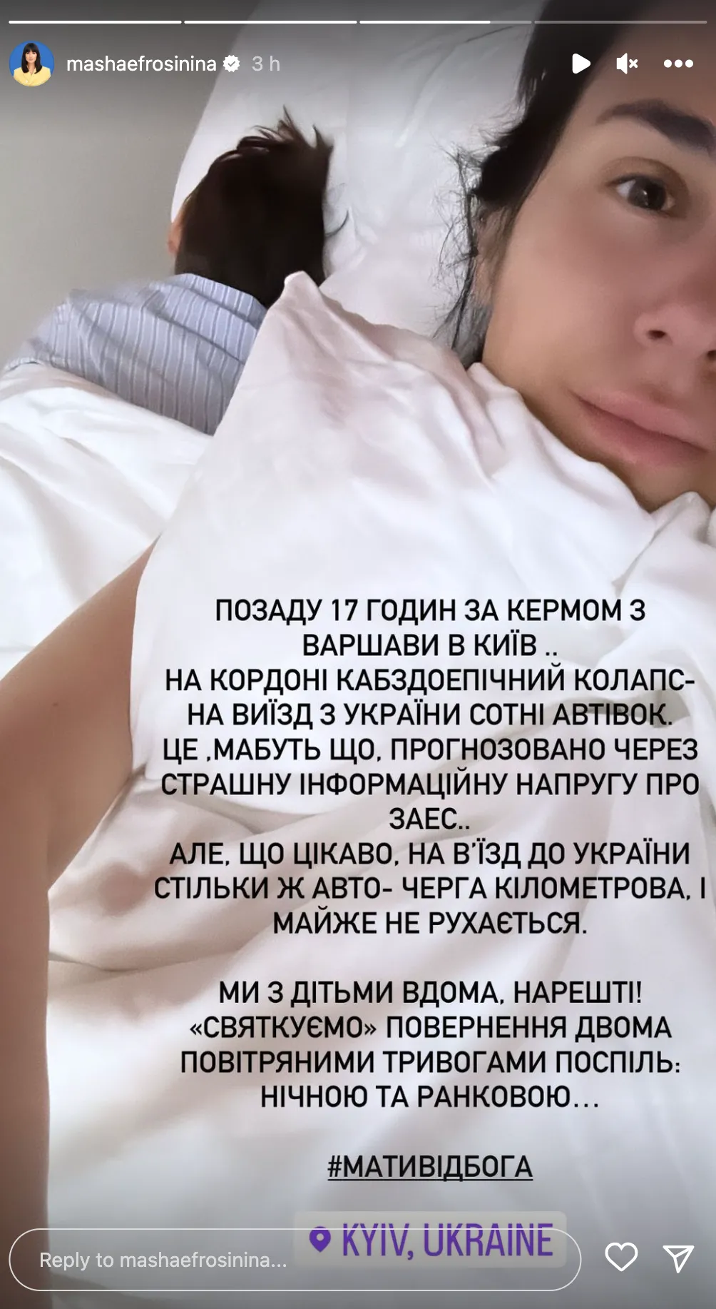 По словам Ефросининой, дорога из Польши в Украину была сложной и заняла 17 часов. Кроме того, по приезду в столицу их "встретили" сирены.