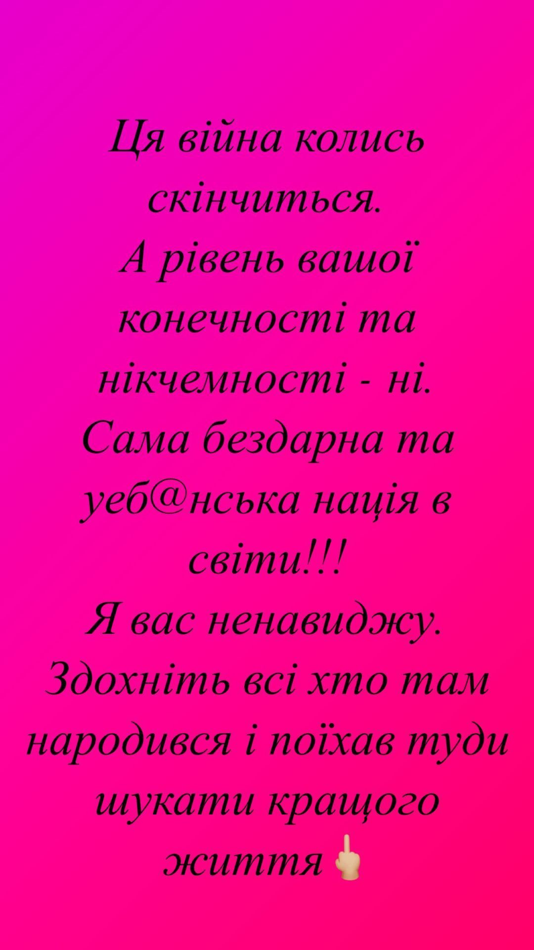 "Эта война когда-нибудь закончится. А уровень вашей ничтожности и кончености – нет. Самая бездарная и убанская нация в мире! Я вас ненавижу. Сдохните все, кто там родился и поехал туда искать лучшей жизни".