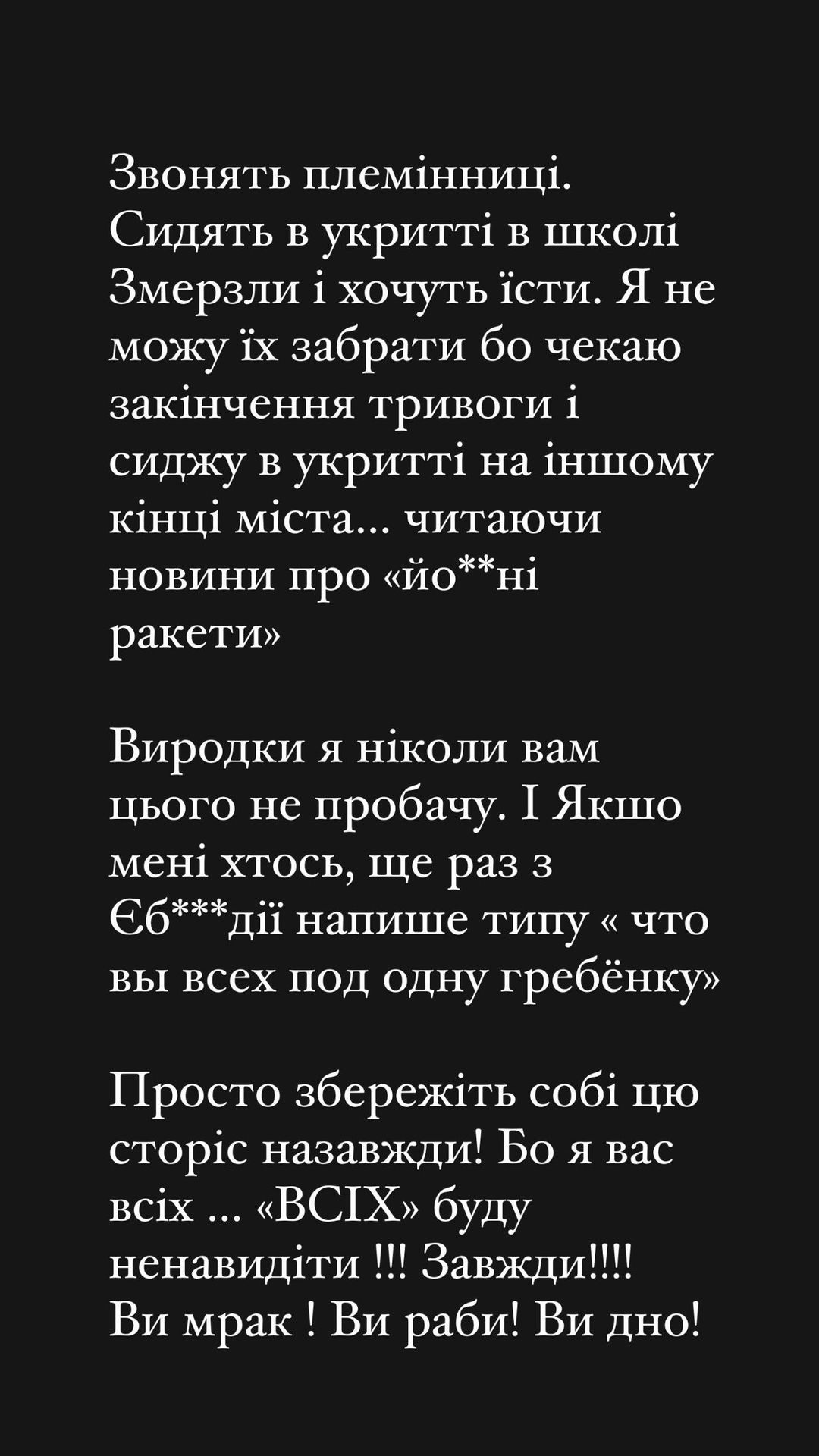 "Звонят племянницы. Сидят в укрытии в школе. Замерзли и хотят есть. Я не могу их забрать, потому что жду окончания тревоги и сижу в укрытии на другом конце города. Читая новости об "и*банных ракетах". Ублюдки, я никогда вам этого не прощу. И если мне еще раз кто-то напишет типа: "гребет всех под одну гребенку"... Просто сохраните себе это стороз навсегда. Ибо я буду вас всех, всех ненавидеть! Всегда! Вы тьма, вы рабы, вы дно!"