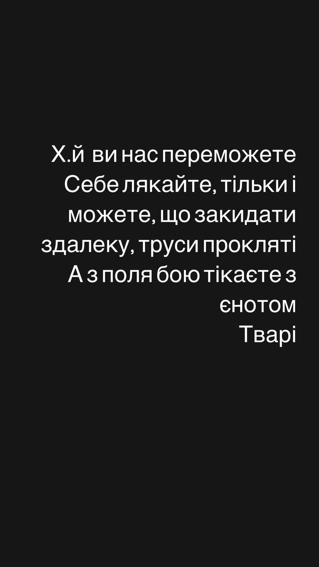 "Х*й вы нас победите. Себя пугайте, только и можете, что забрасывать издалека, трусы проклятые. А с поля боя убегаете с енотом, твари".