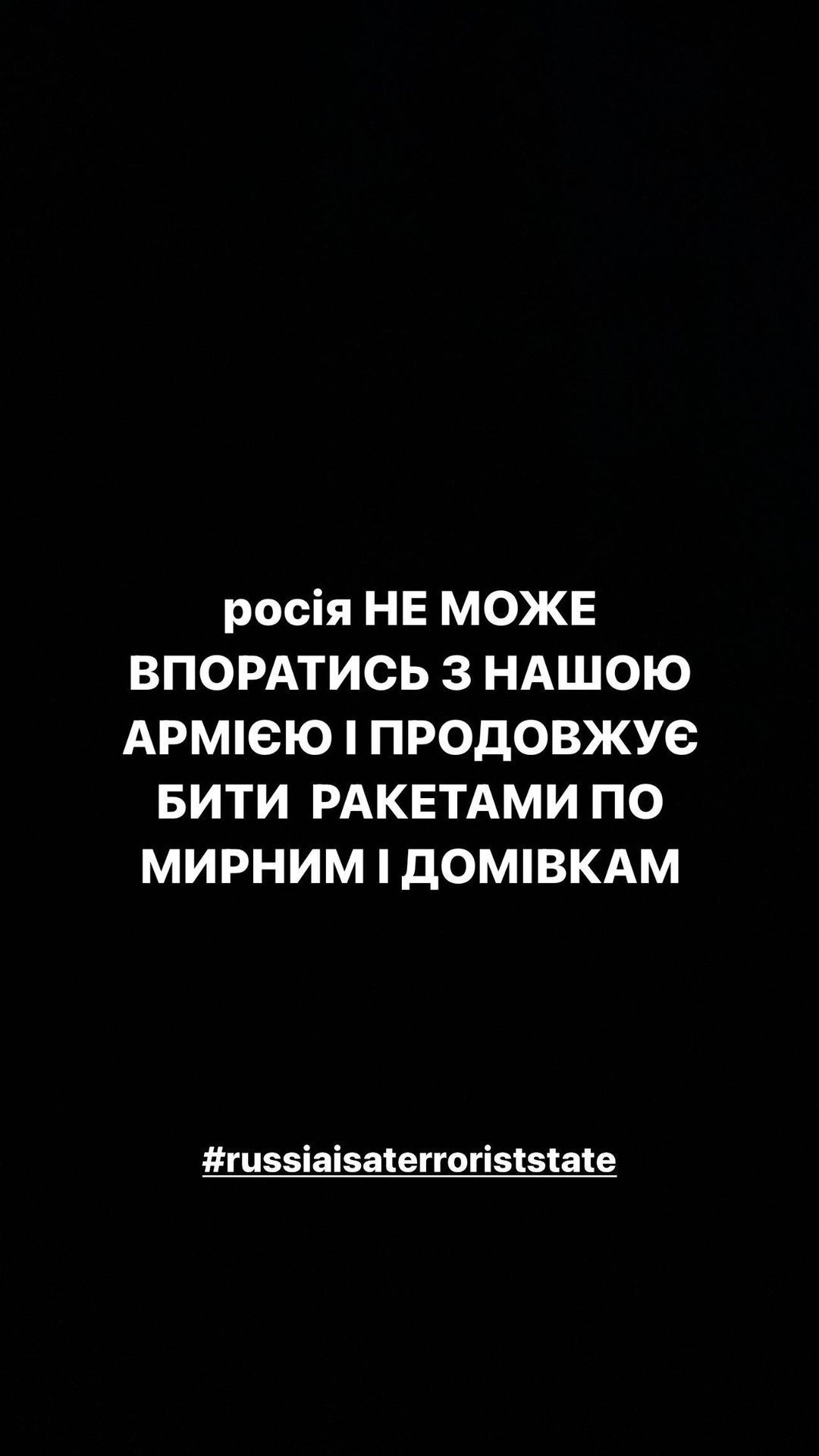 "Спасибо всем, кто написал, кто заботится, мне очень приятно. Я в безопасности, со мной все хорошо, хотя на момент прилета я находилась неподалеку и это была мощная взрывная волна, было очень страшно, люди начали прятаться, закрывать головы руками. Слава Богу, что моя мама успела уехать, она пока что в метро", – поделилась звезда.