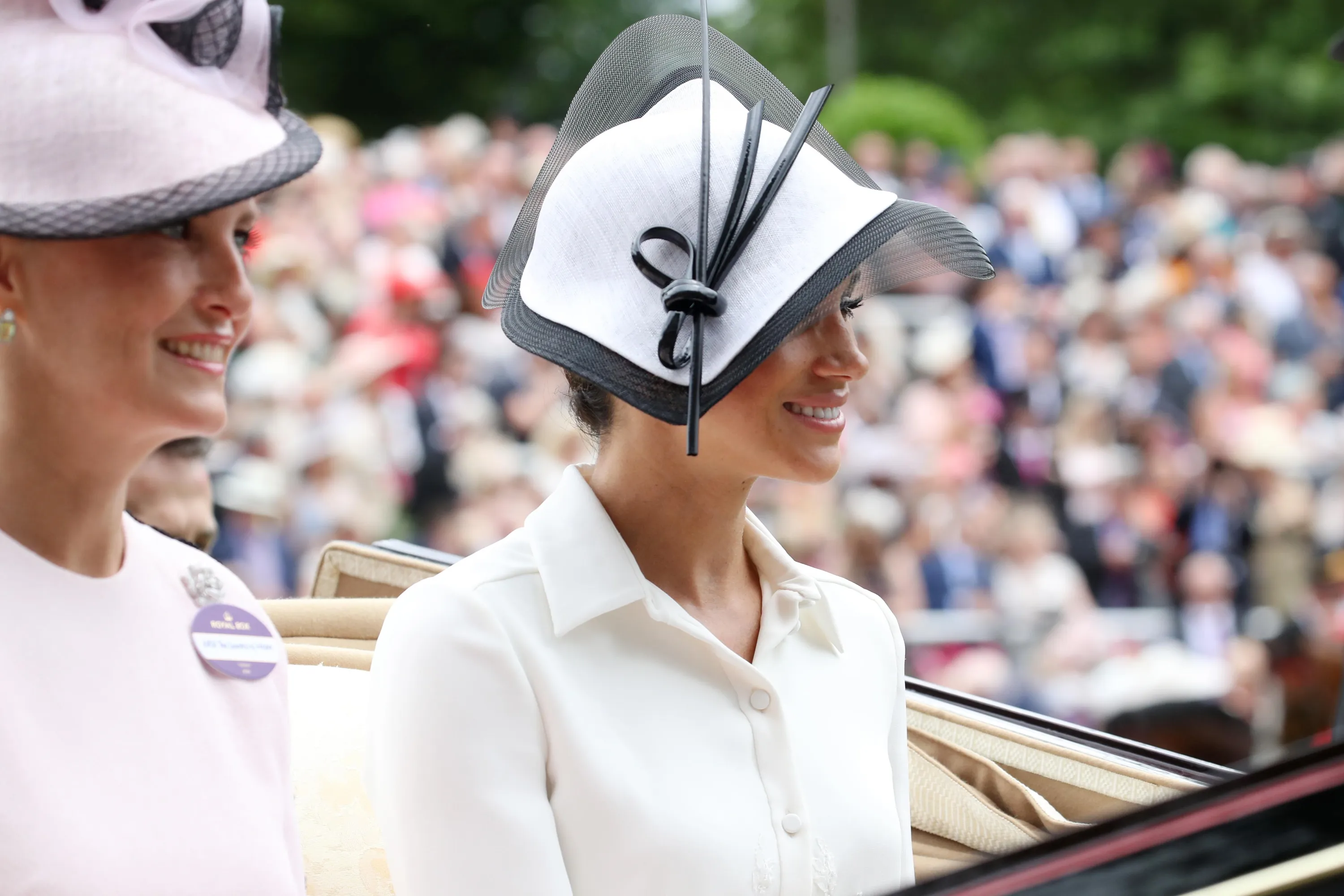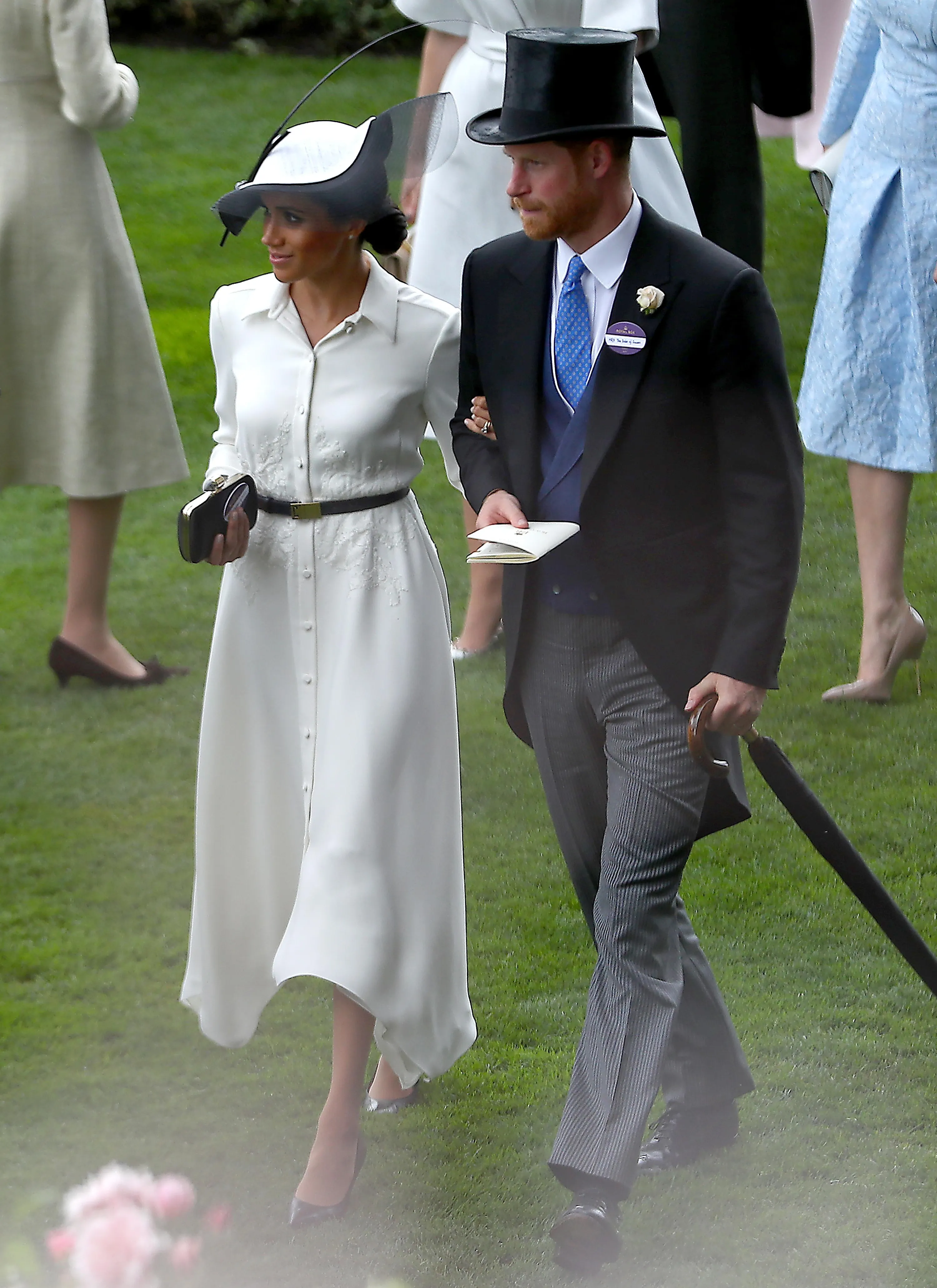 На свои первые скачки Royal Ascot Меган выбрала белоснежное платье Givenchy, шляпку Philip Treacy, черные туфли и клатч Givenchy.