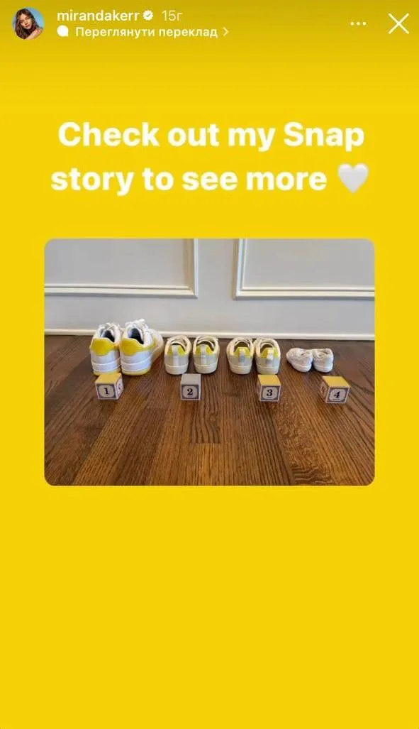 Миранда опубликовала несколько фото в соцсетях. Сначала она намекнула на четвертого ребенка парами кроссовок, которые выставила в ряд.