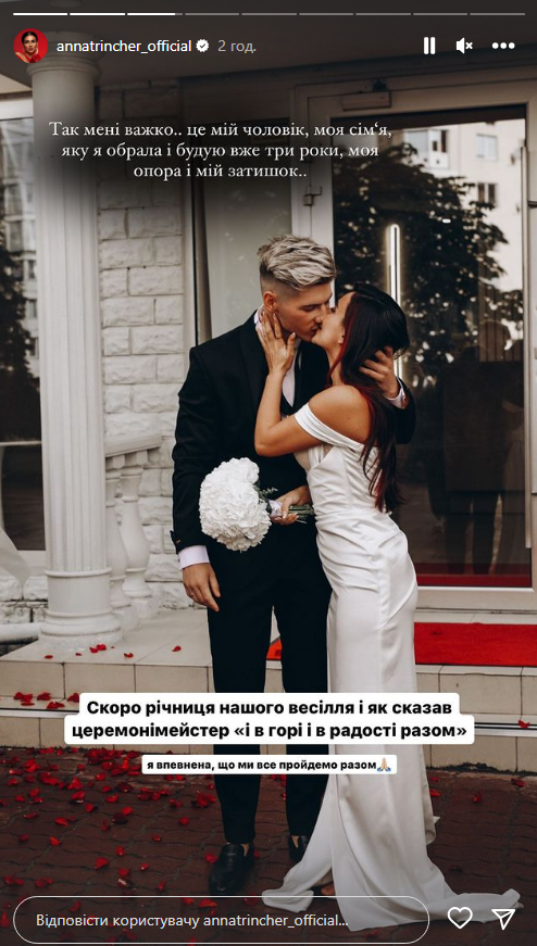 В августе Анна Тринчер сообщила, что они с мужем решили на время разъехаться. Выяснилось, что такое решение влюбленные приняли на семейной сессии у психолога. Они обратились к специалисту, потому что переживают кризис в отношениях.
