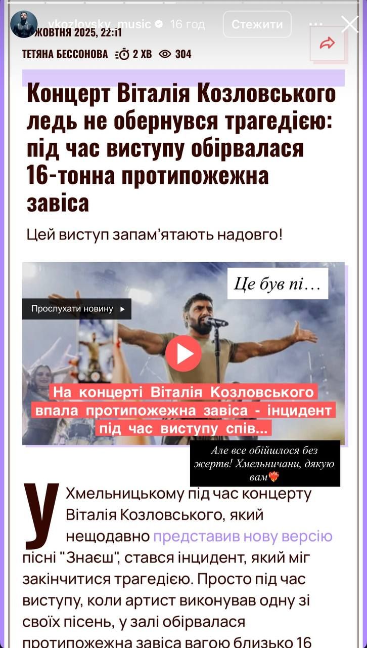 - Во время концерта Виталия Козловского в Хмельницком оборвалась противопожарная завеса весом 16 тонн, повредив часть оборудования.