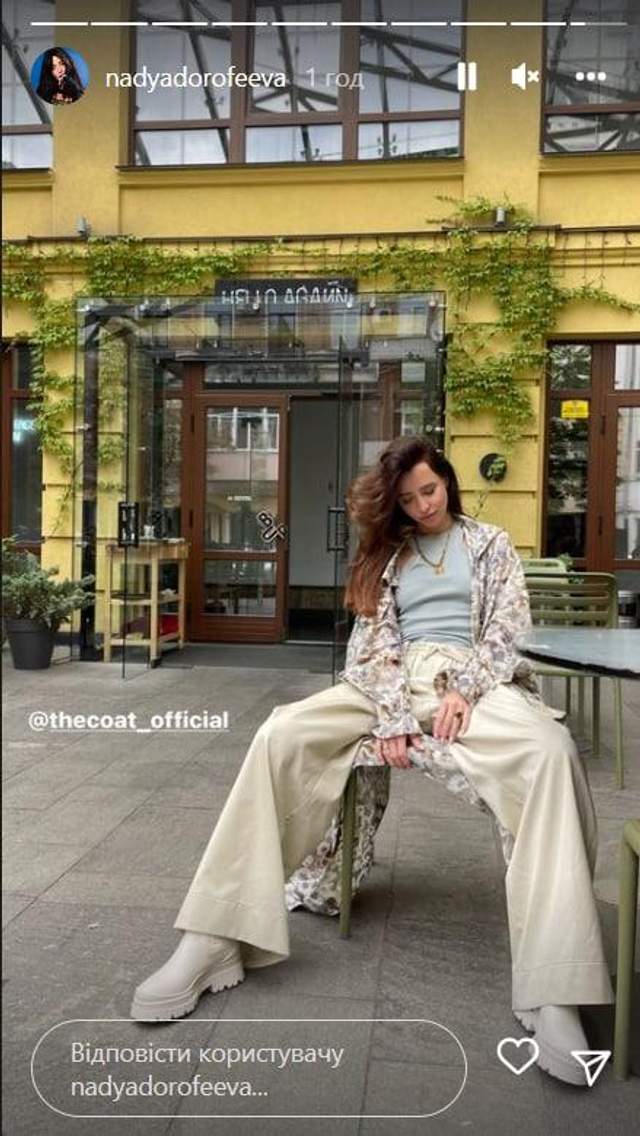 Артистка начала утро с похода в любимое кафе, где полакомилась ароматным кофе, сделала фото и продемонстрировала эффектный look. Поскольку в Киеве прохладно, то артистка надела светлый oversize наряд. Кофта была с длинными рукавами, поэтому Надя смело могла сидеть с кофе на улице.