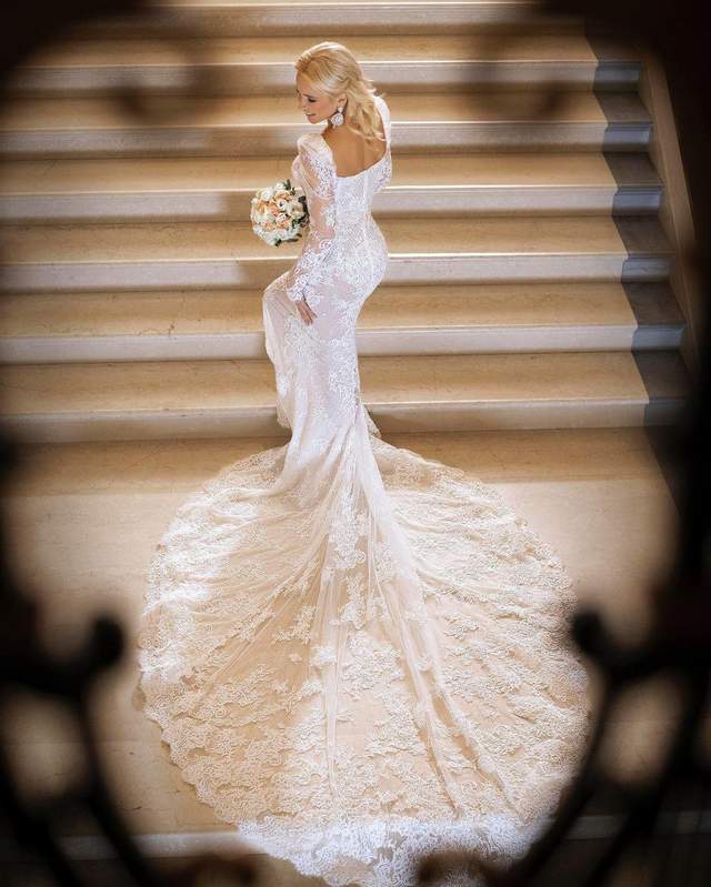 Лилия предстала перед камерой фотографа в силуэтном кружевном платье белоснежного цвета. Наряд имел Соблазнительное декольте и длиннющий шлейф. Такой look она соединила с белыми туфлями-лодочками на каблуке, довершила аутфит изысканными серьгами. Волосы звезда вложила в локоны и аккуратно сцепила, а на лице сделала макияж с коричневыми тенями на веках.