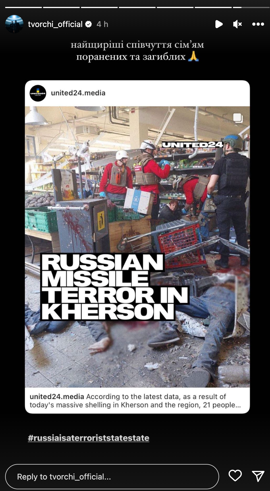 TVORCHI отреагировали на атаку Херсонщины / Скриншот инстаграм-сторис