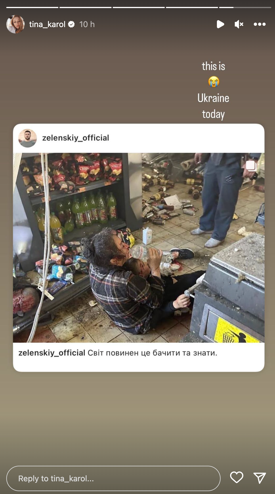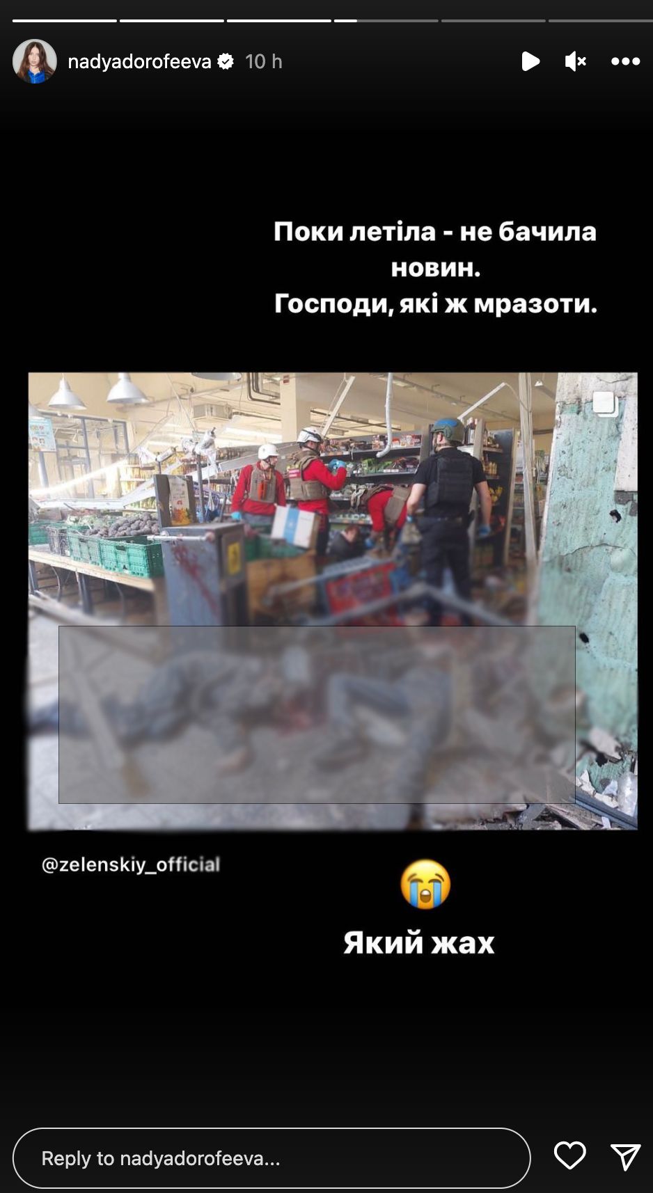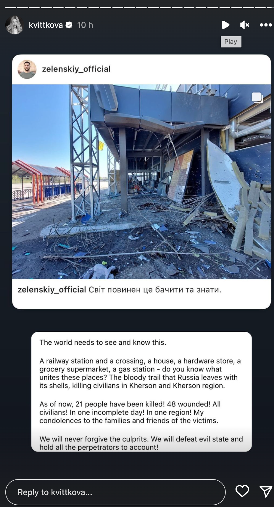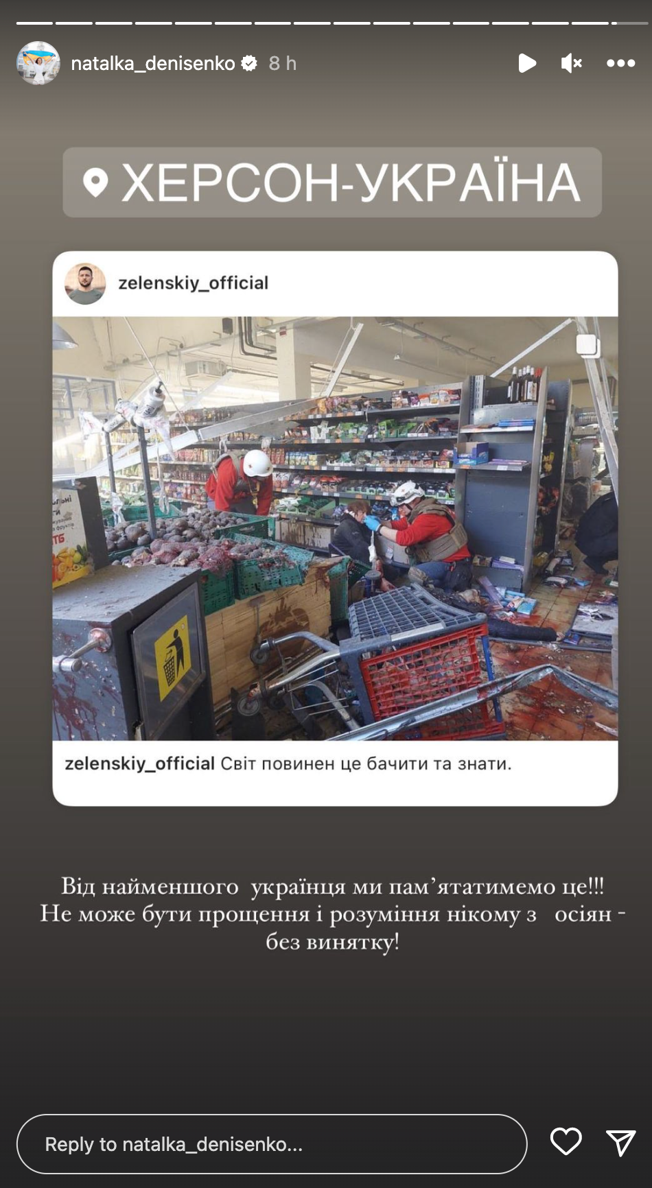 Звезда в соцсетях в очередной раз напомнила, что Россия – это нация террористов. Она перепостила фотографии, которые показал президент Владимир Зеленский. Также Никитюк выразила соболезнования семьям погибших в Херсоне.